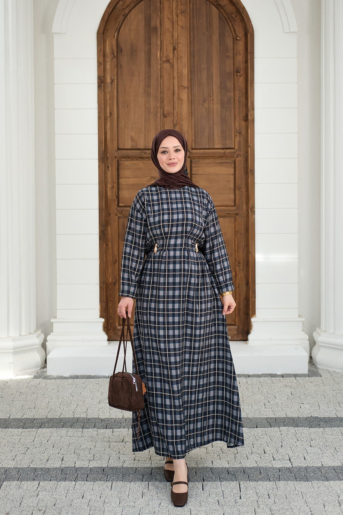 Ekose Desen Bronş Detay Arkadan Bağlamalı Elbise Lacivert
