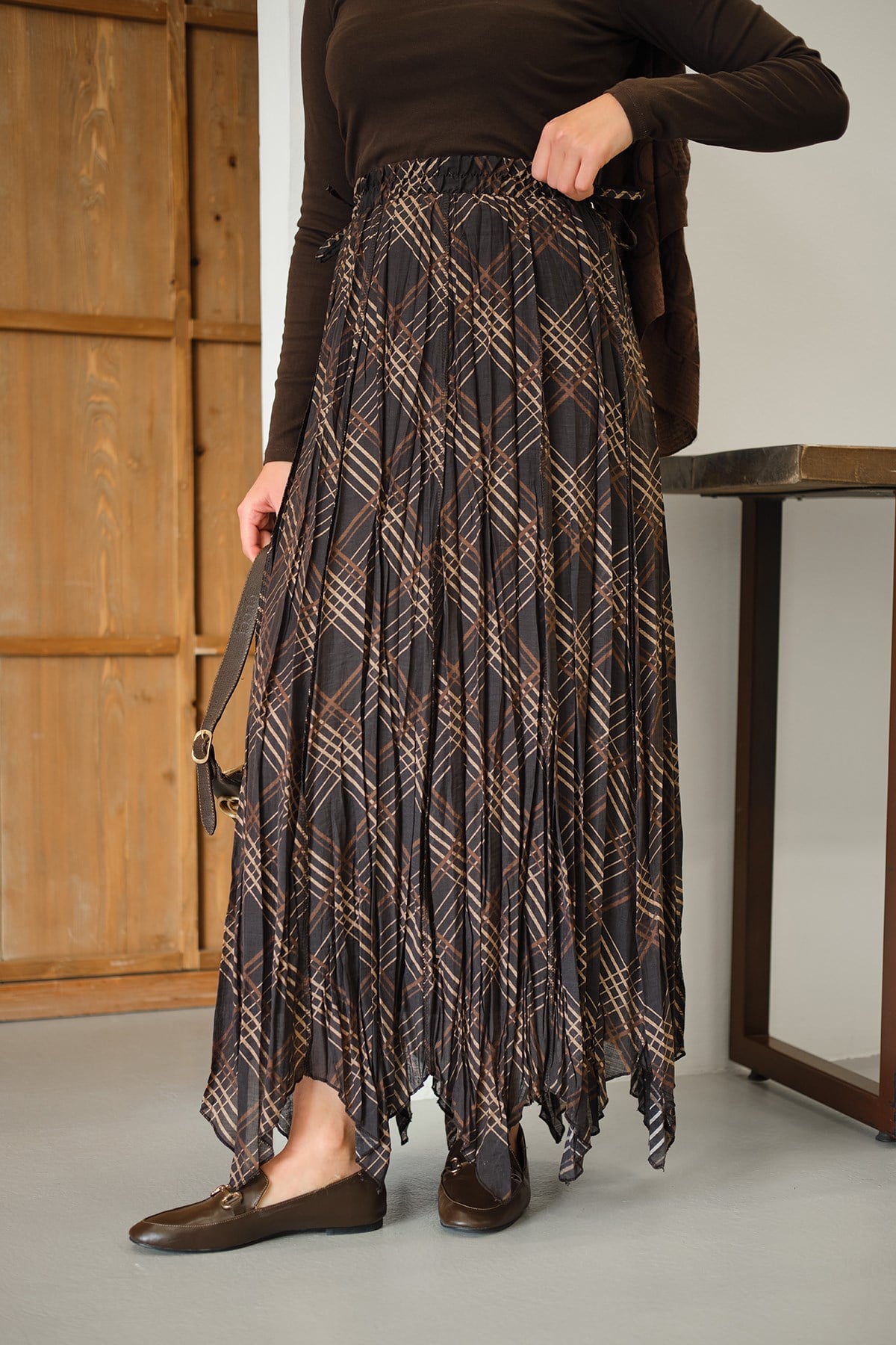 Ekose Desen Dikiş İzli Yandan Bağcık Detaylı Şifon Etek Kahverengi