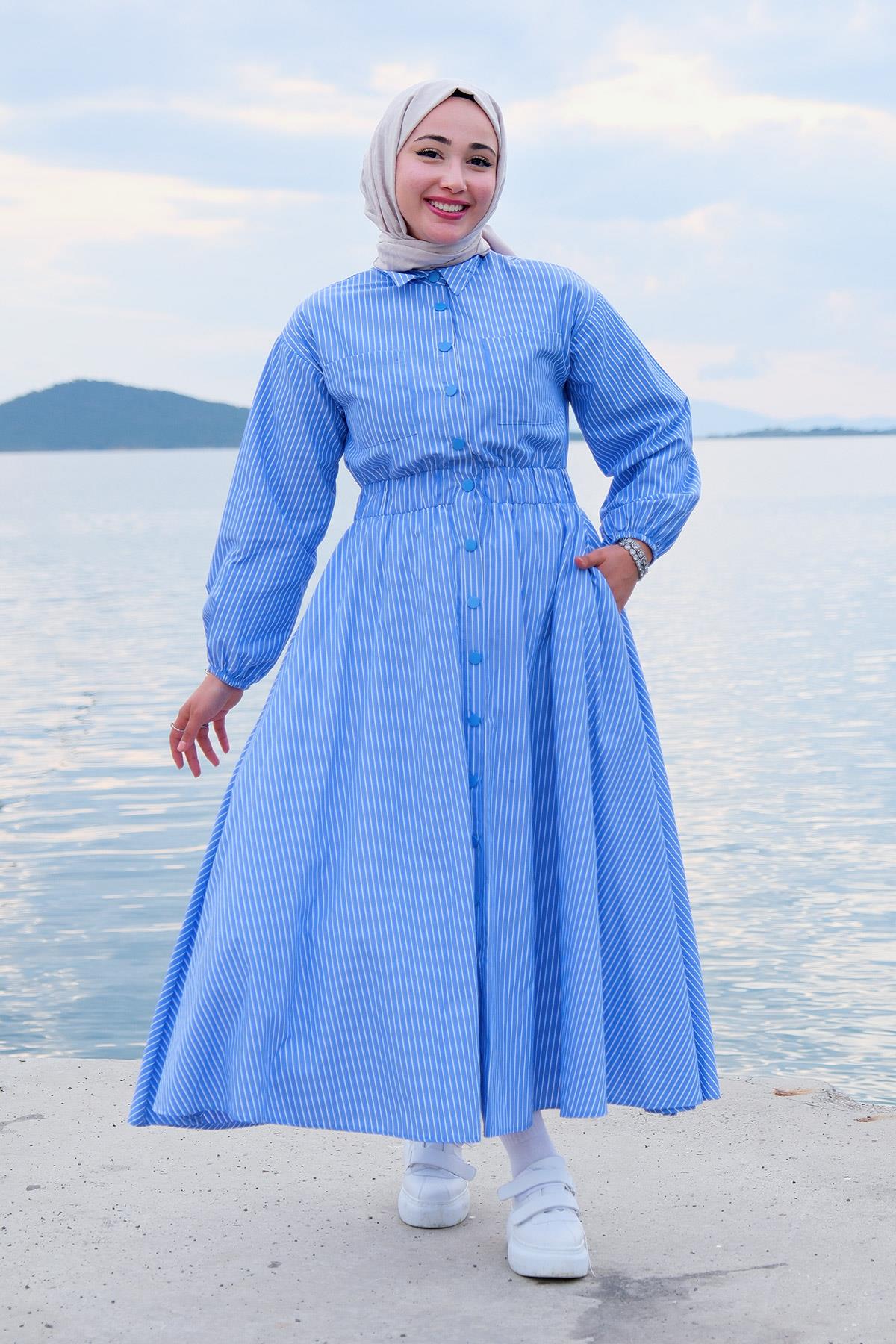 Çift Cepli Gömlek Elbise Mavi
