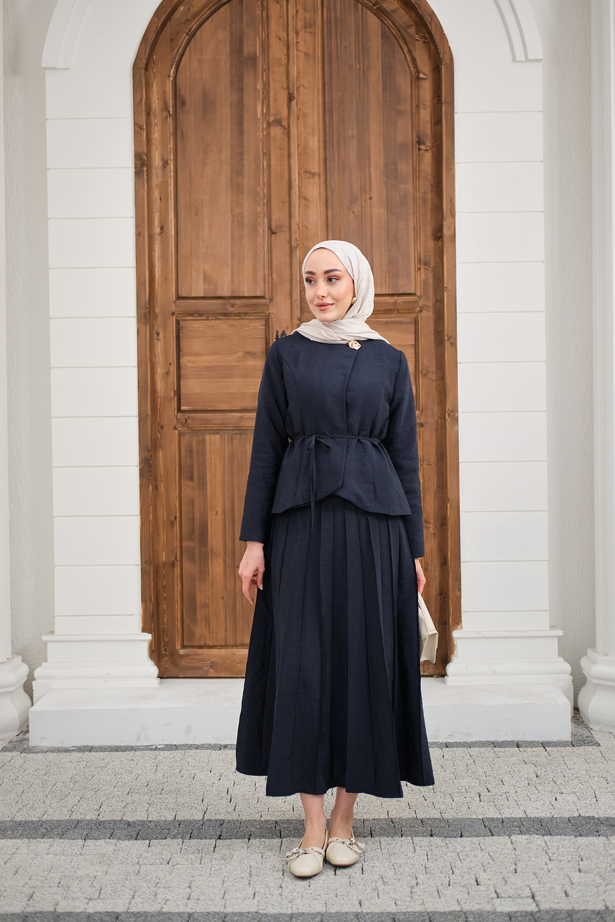 Eteği Pileli Ceketi Yandan Düğmeli Takım Lacivert