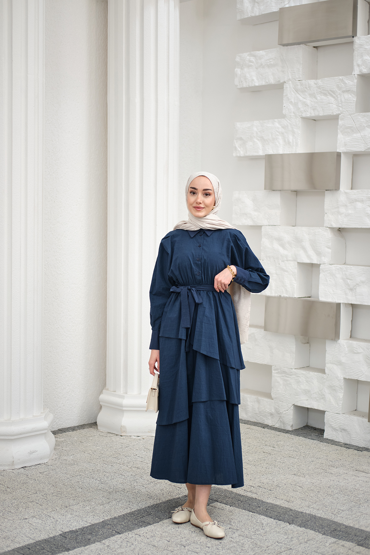 Eteği Volanlı Bel Bağlamalı Gömlek Yaka Yarım Düğmeli Elbise İndigo Mavi
