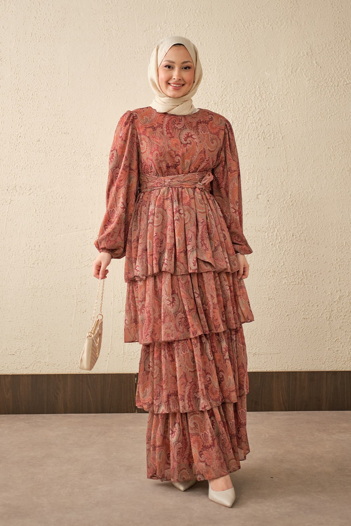 Etnik Desen Arkadan Bağlamalı Elbise Bordo