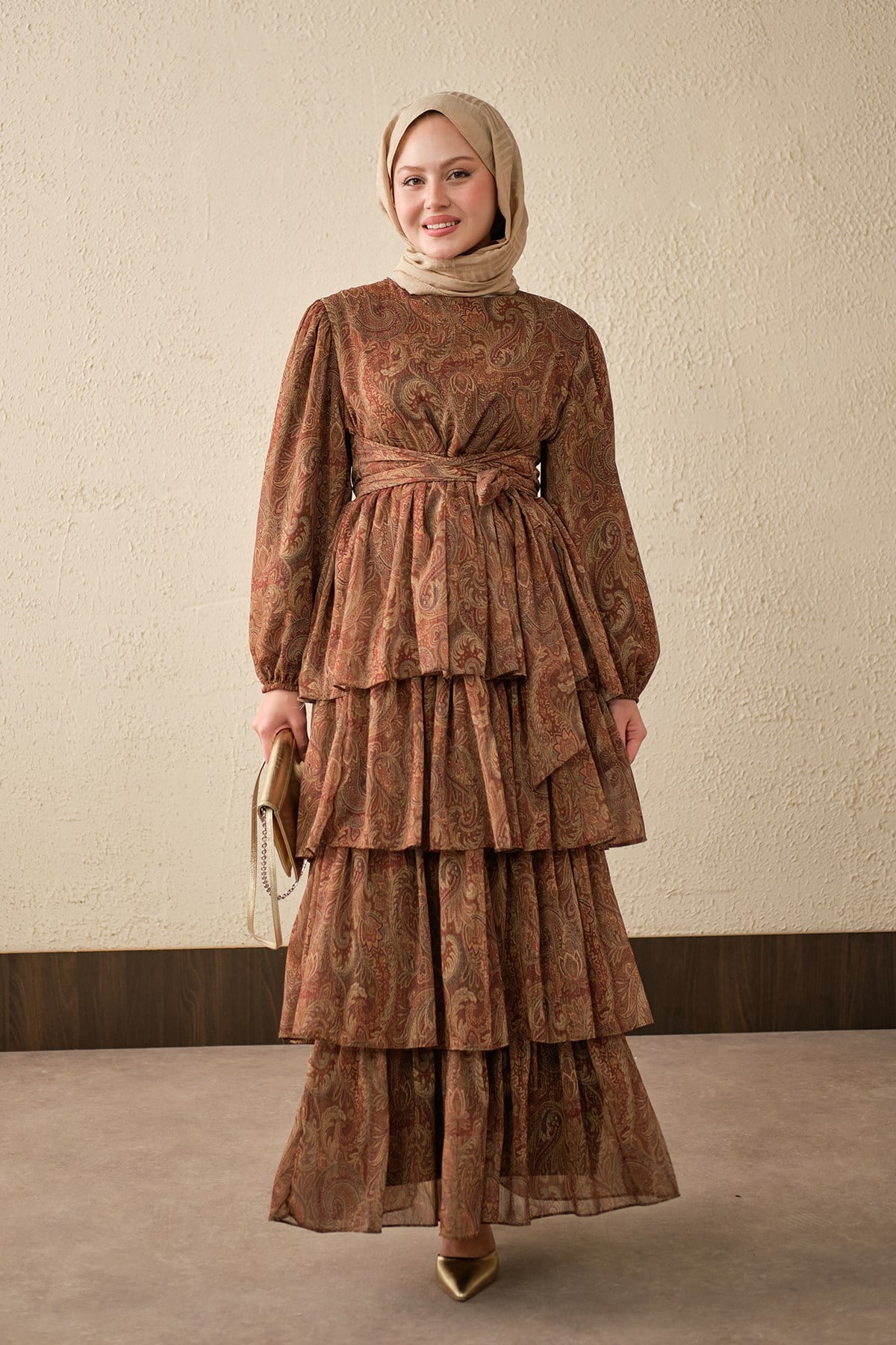 Etnik Desen Arkadan Bağlamalı Elbise Kahverengi