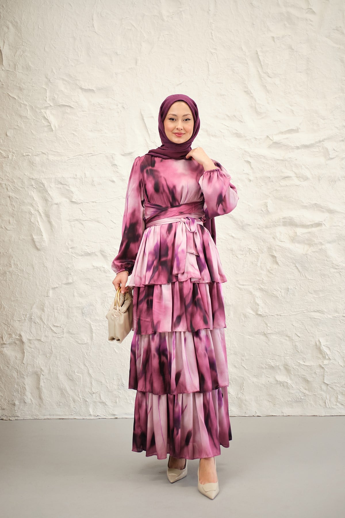 Etnik Desen Arkadan Bağlamalı Elbise Mor