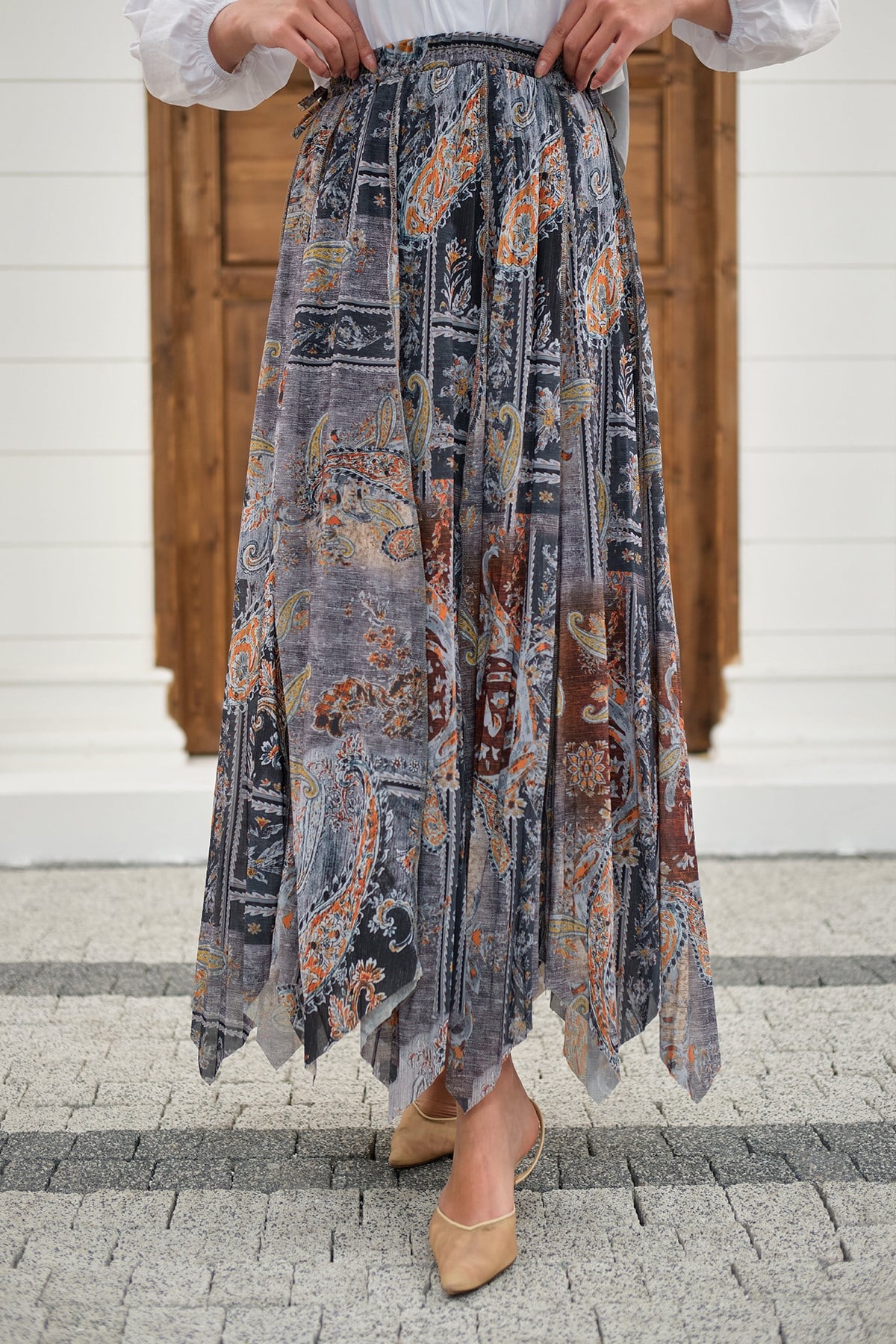 Etnik Desen Asimetrik Kesim Şifon Etek Antrasit