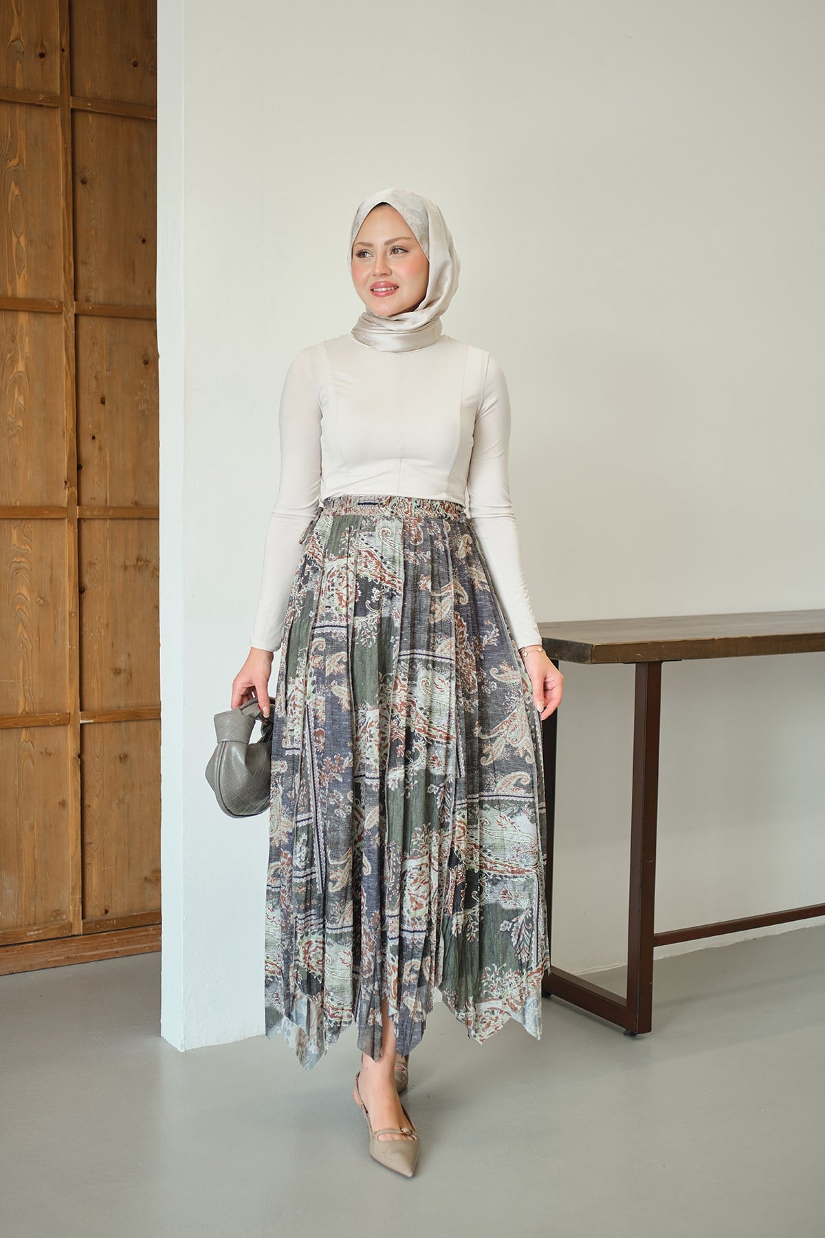 Etnik Desen Asimetrik Kesim Şifon Etek Yeşil