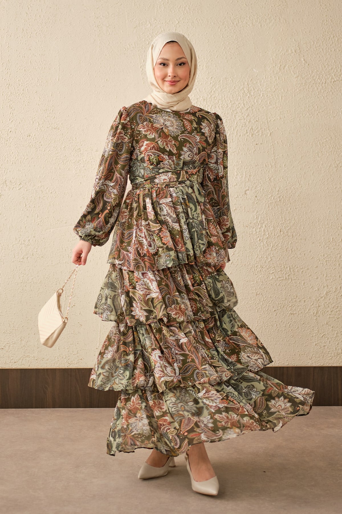 Etnik Desen Bel Bağlamalı Elbise Haki Yeşil