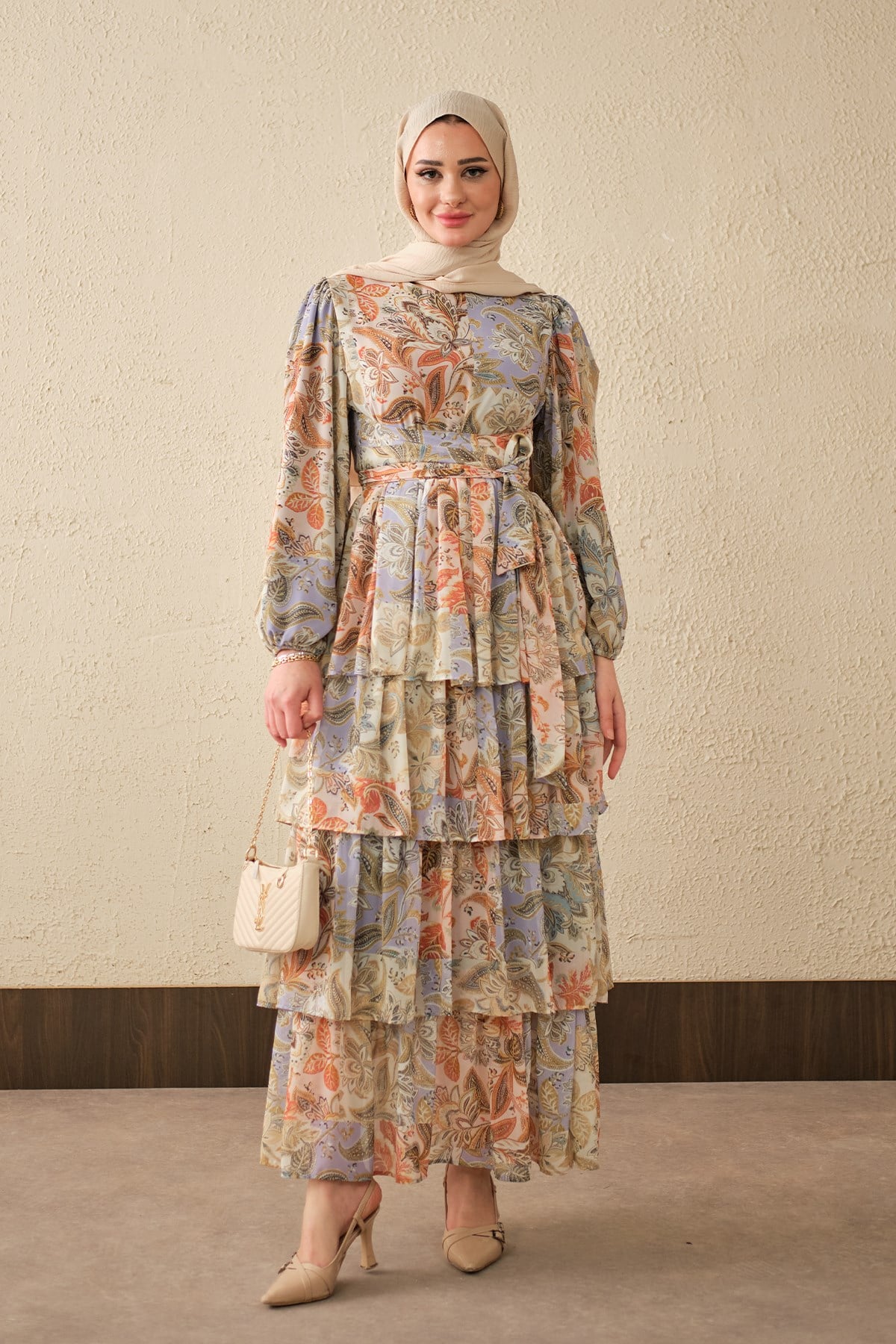 Etnik Desen Bel Bağlamalı Elbise Lila