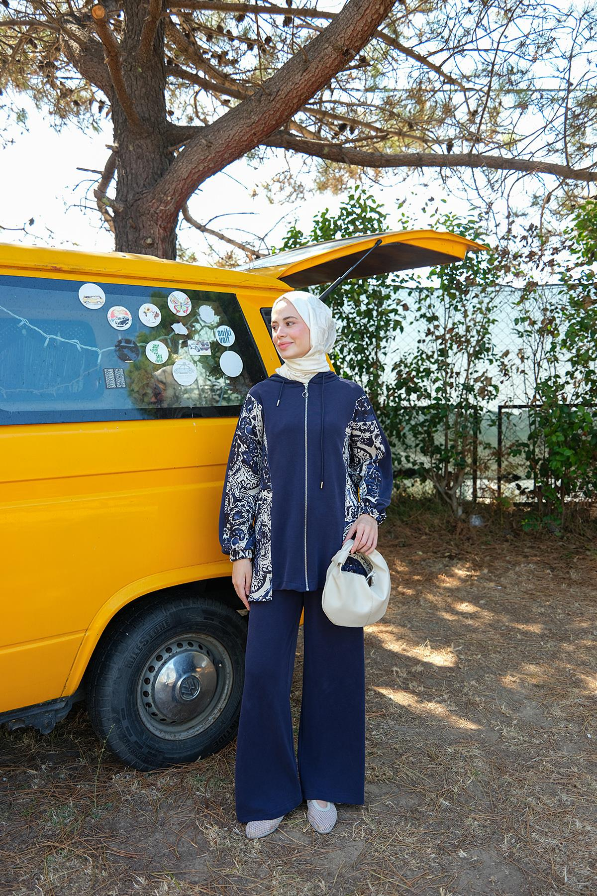 Etnik Desen Kapüşonlu İkili Takım Lacivert