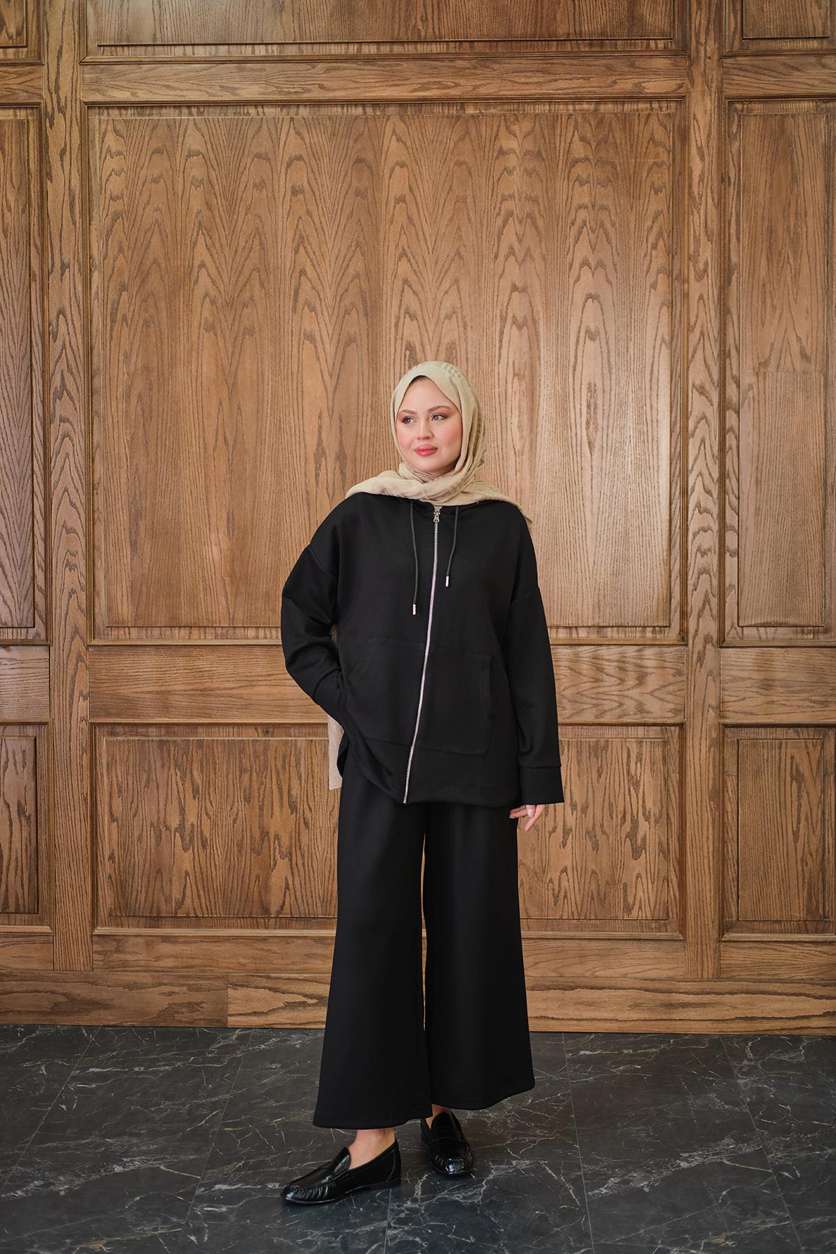 Fermuar Detay Kapüşonlu Takım Siyah