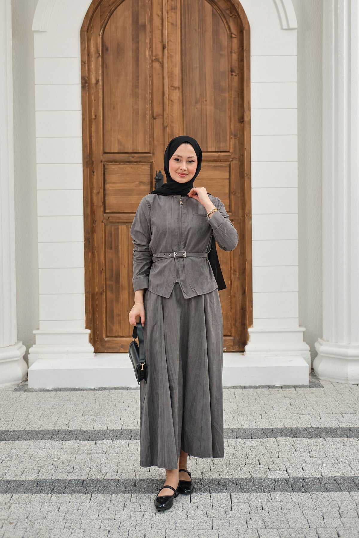 Fermuarlı Cep Detay Kemer Bağlamalı Etekli Takım Gri