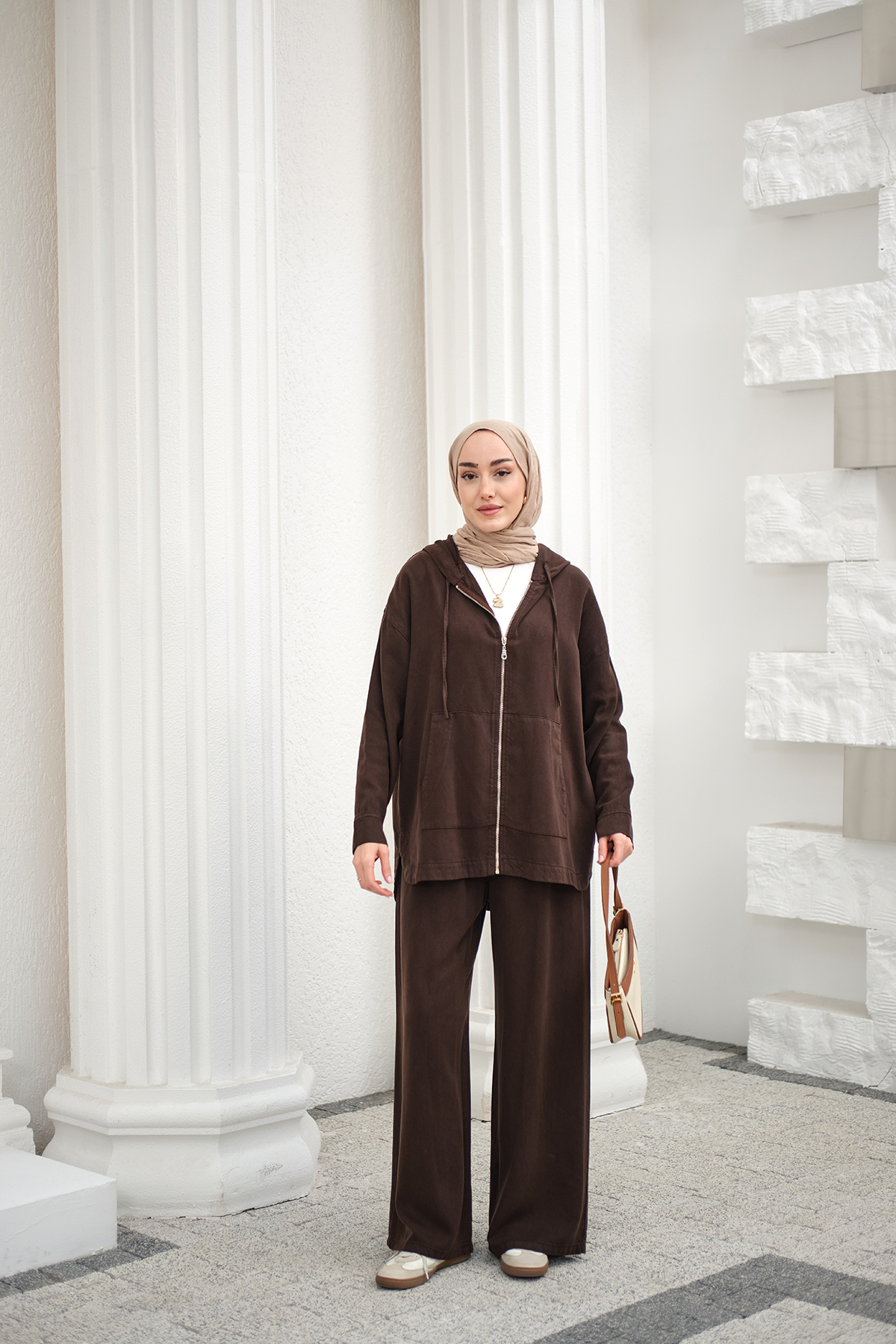 Fermuarlı Çift Cepli Kapüşonlu Pantolonlu Takım Kahverengi