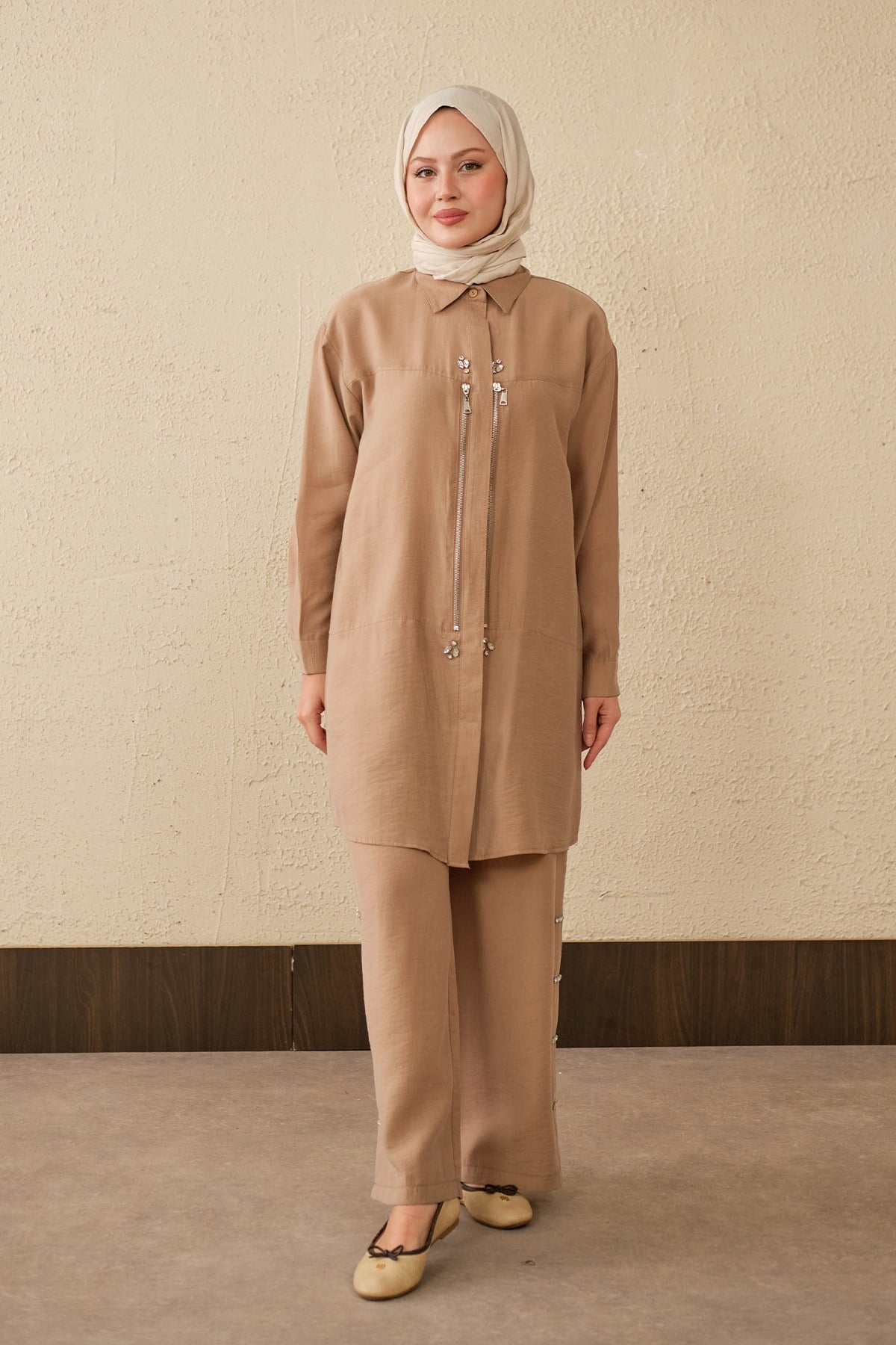 Fermuarlı Ve Boncuk Detaylı Pantolonlu Takım Vizon