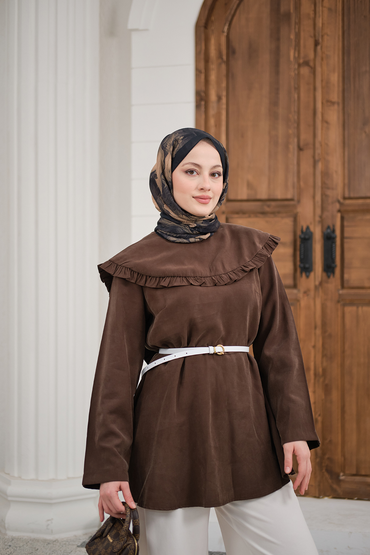 Fırfır Detay Dikiş Pensli Tunik Kahverengi
