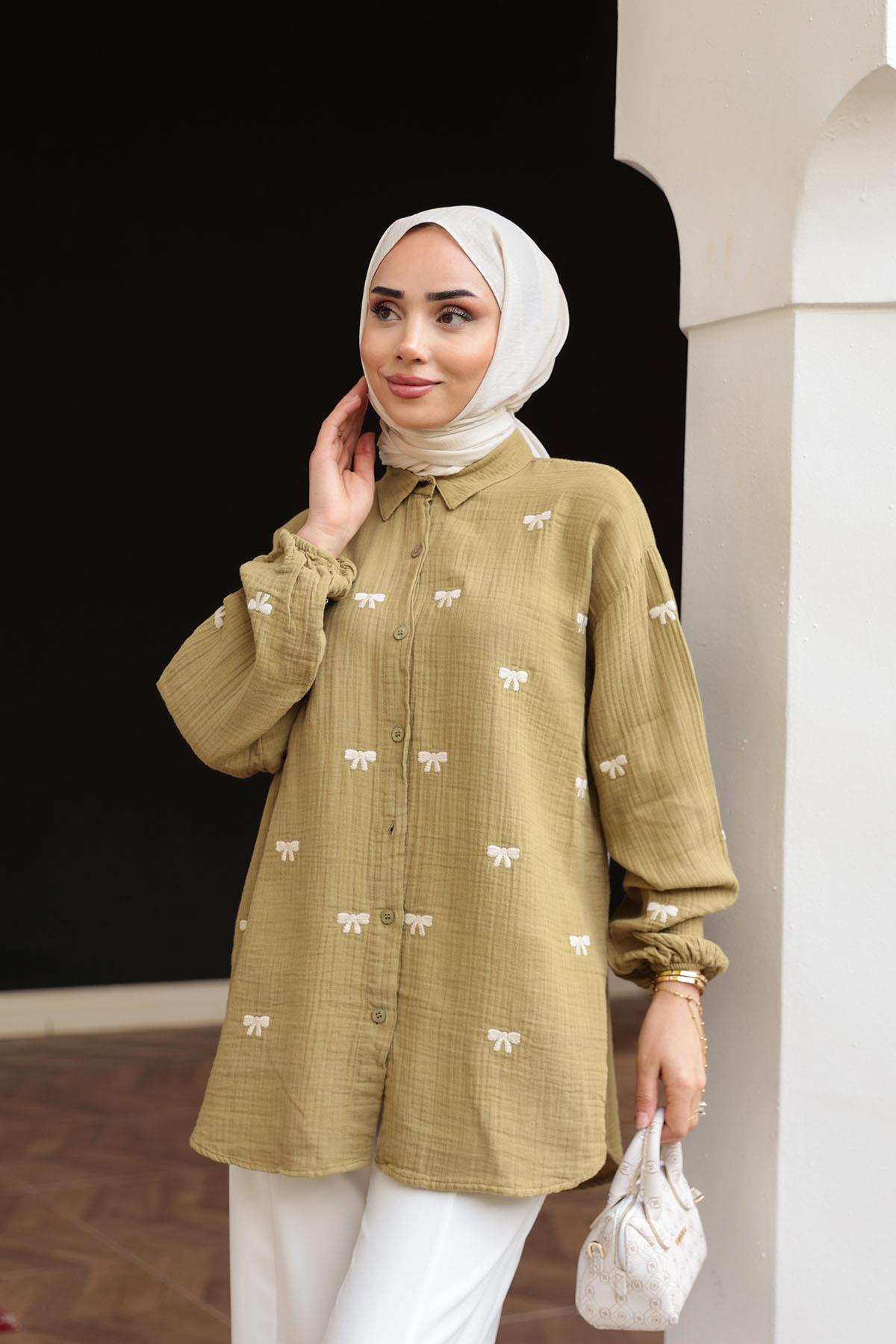 Fiyonk Nakış Detaylı Gömlek Yağ Yeşil