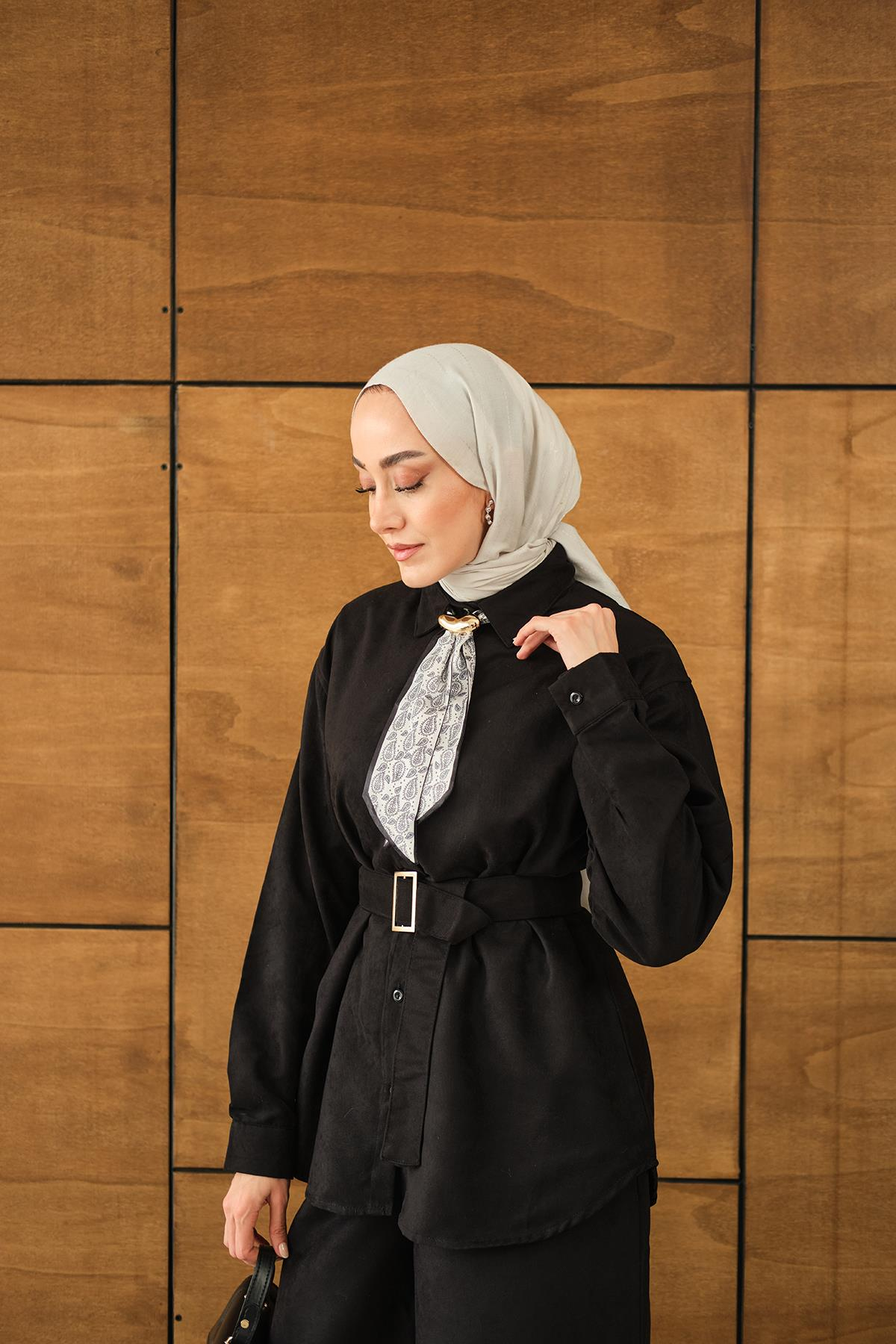 Fularlı Gömlekli Takım Siyah