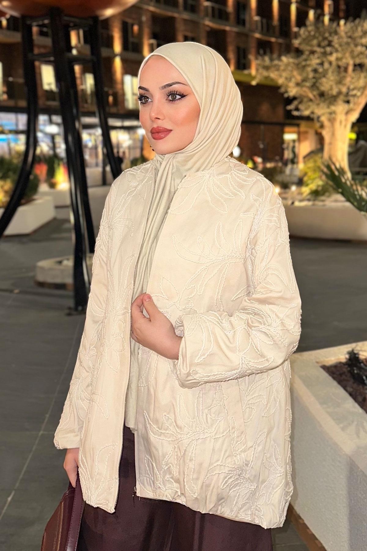 Ekru renginin zarafetiyle buluşan bu gabardin nakışlı bomber ceket, LOCCO’nun özenle tasarladığı nakış işlemeleriyle dikkat çekiyor. Omuzdan bele kadar uzanan zarif nakışlar, günlük kombinlerinize sofistike bir dokunuş katarken; bisiklet yaka ve bomber kesim, modern ve dinamik bir görünüm sunuyor. Ürün fotoğrafında görebileceğiniz gibi, ekru tonundaki kumaşın doğal parlaklığı nakış işçiliğini ön plana çıkarıyor.