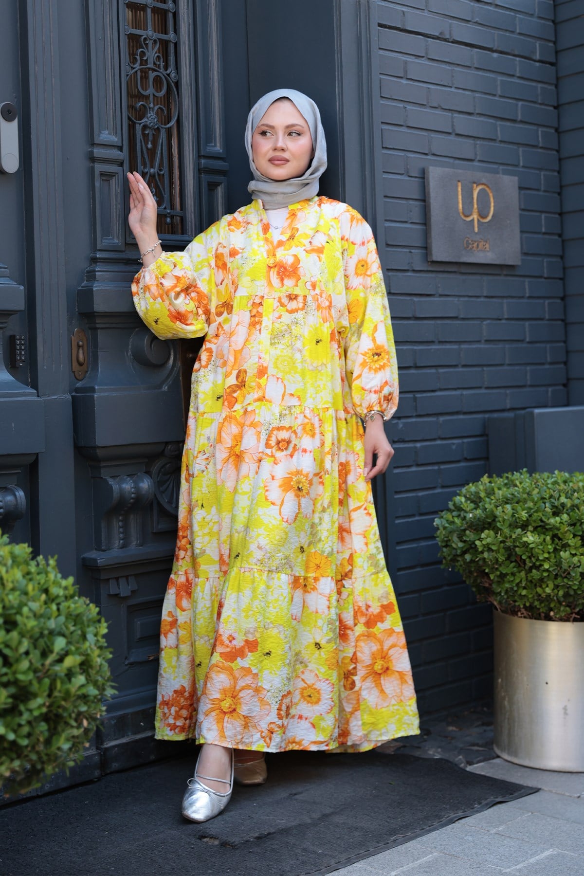 Gelincik Çicek Desenli Elbise sarı-turuncu