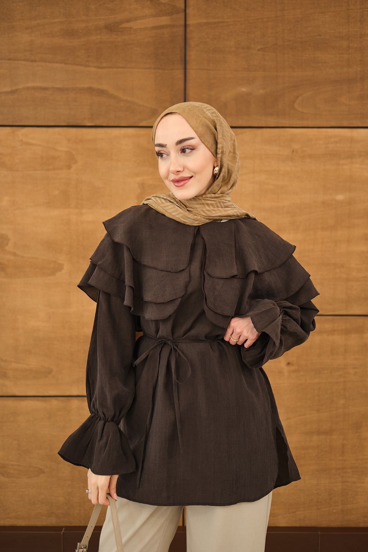 Geniş Katlı Yaka Bel Bağlamalı Tunik Kahverengi