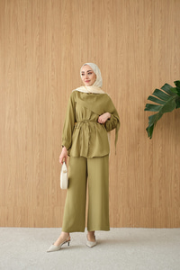 Gizli Düğme Detay Bel Bağlamalı Takım Fıstık Yeşil