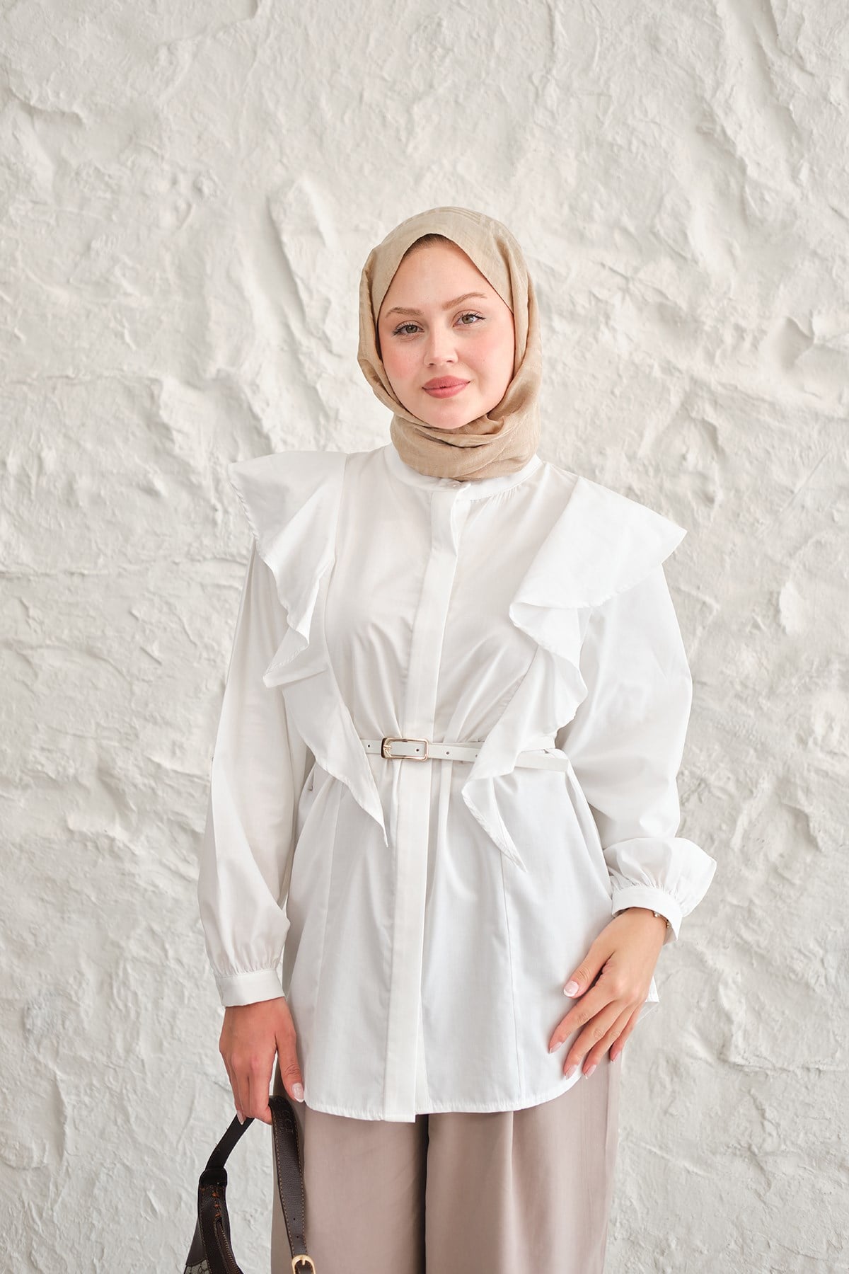 Gizli Düğme Detay Omuzdan Volanlı Gömlek Beyaz