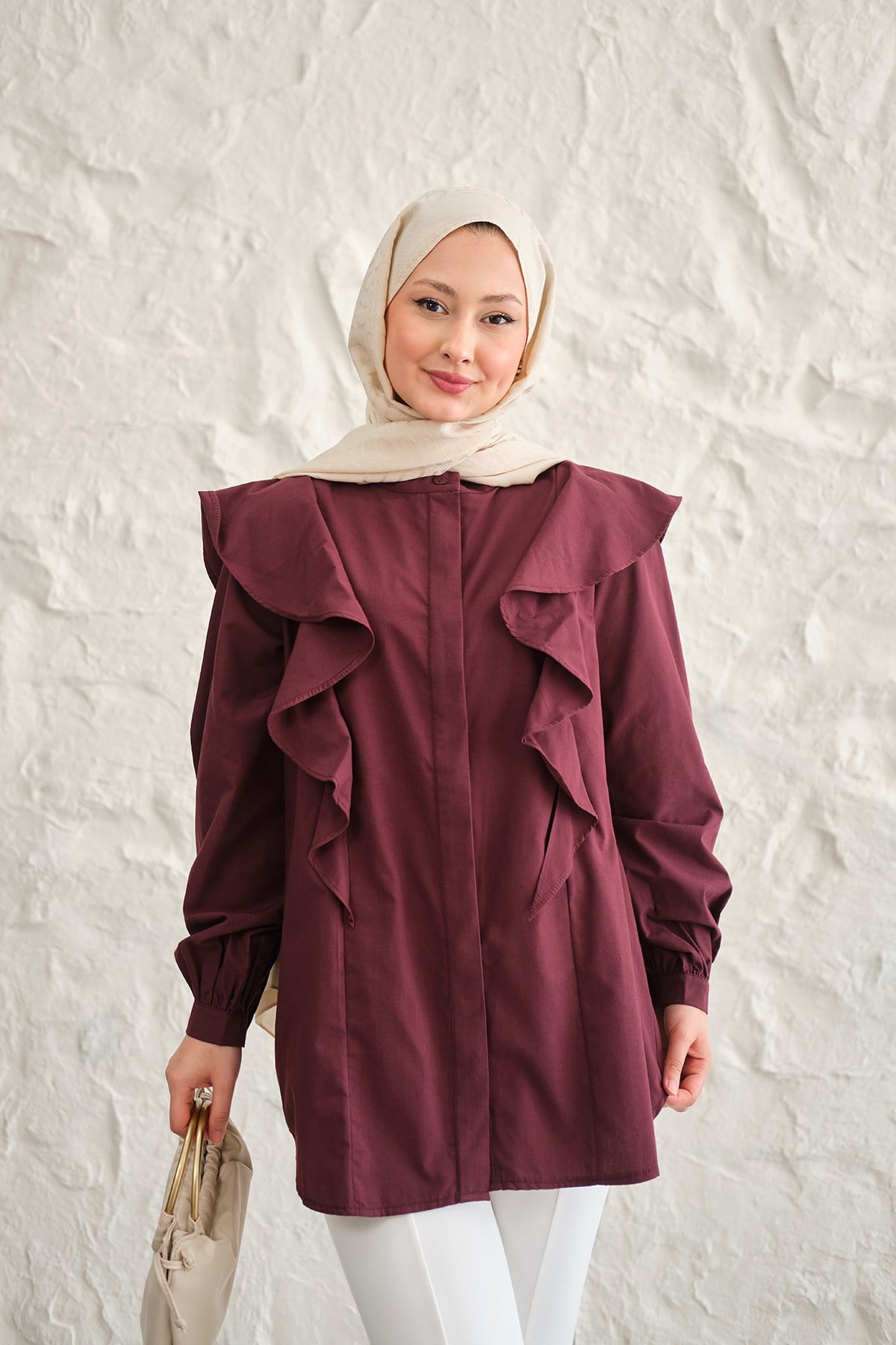 Gizli Düğme Detay Omuzdan Volanlı Gömlek Bordo
