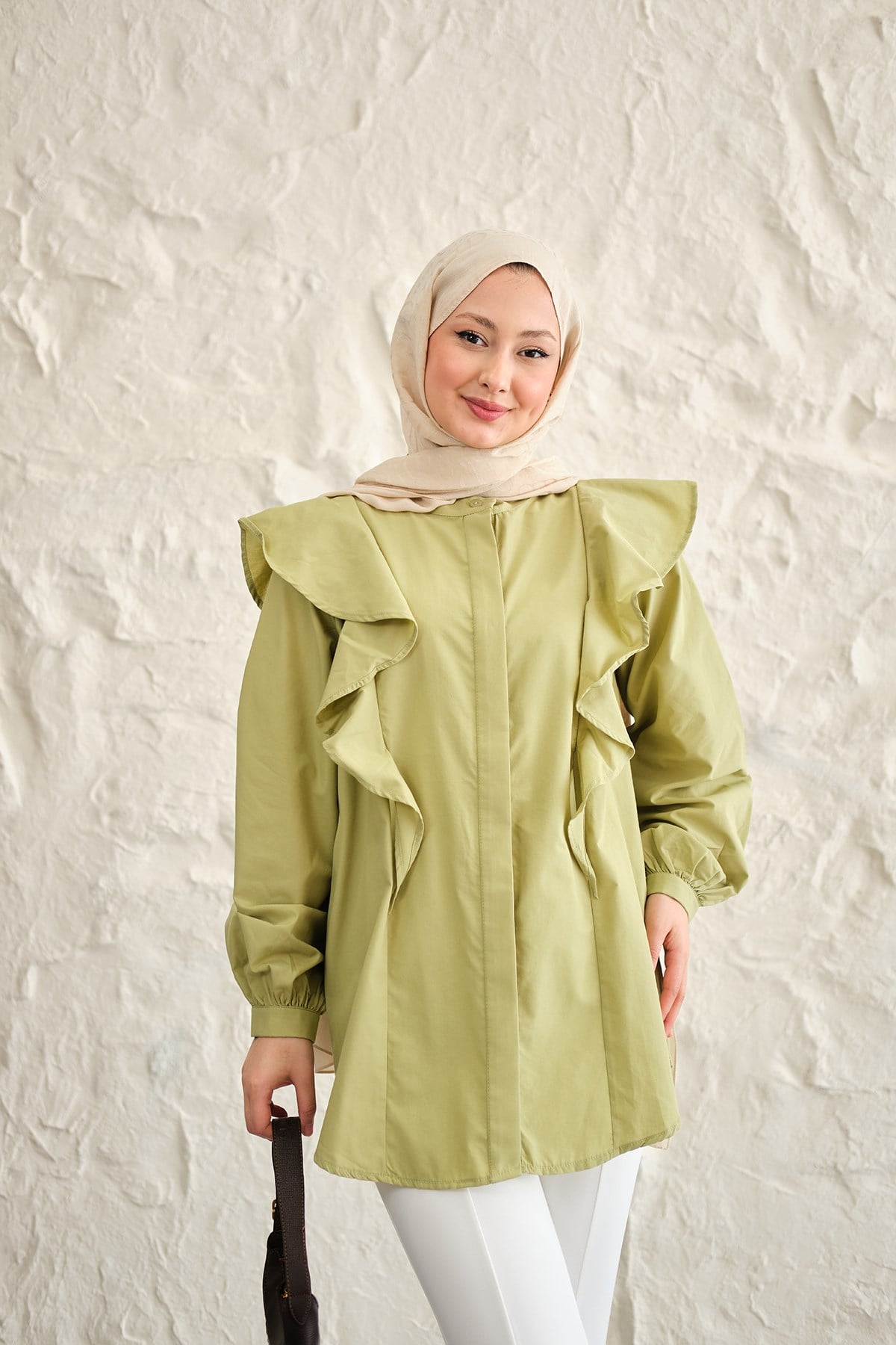 Gizli Düğme Detay Omuzdan Volanlı Gömlek Yeşil