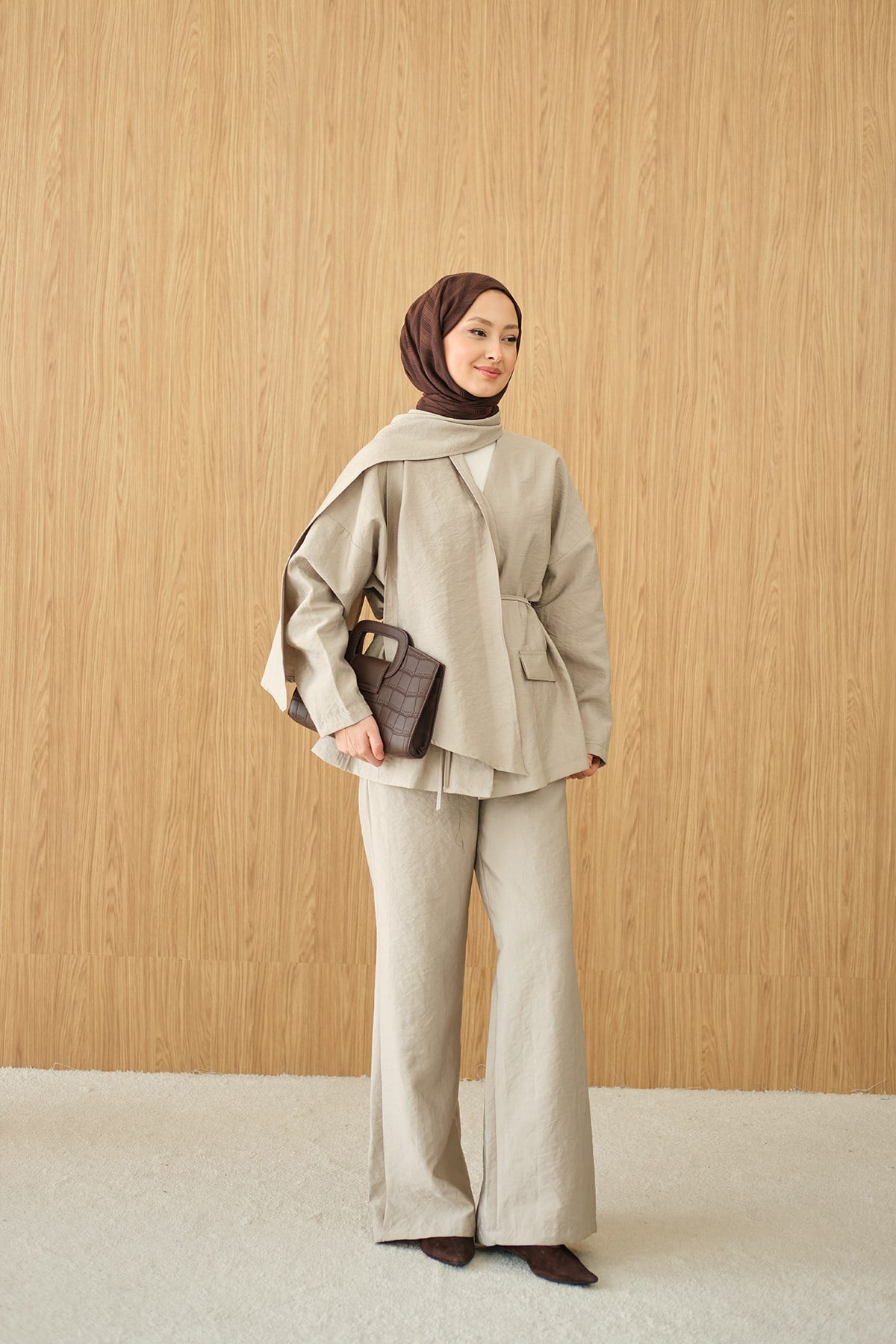 Gizli Düğme Detay V Yaka Takım Krem