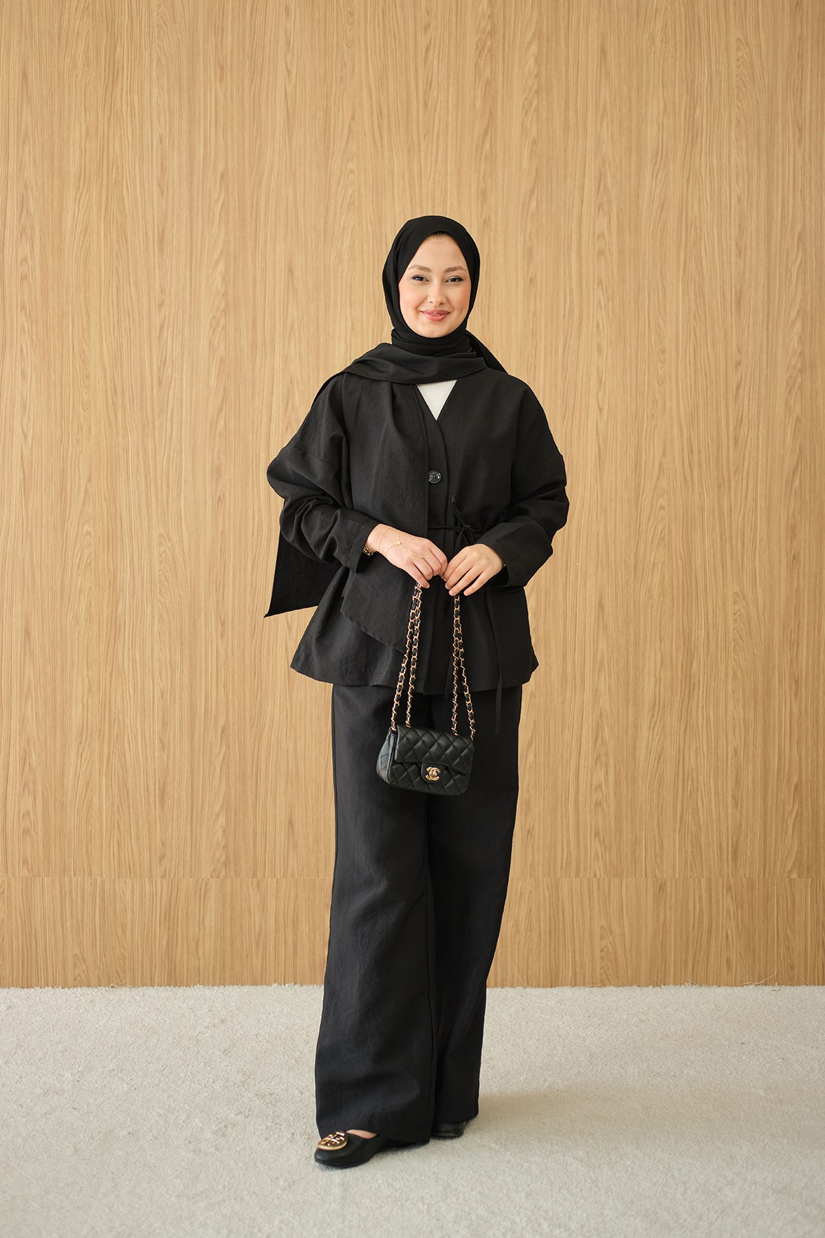 Gizli Düğme Detay V Yaka Takım Siyah