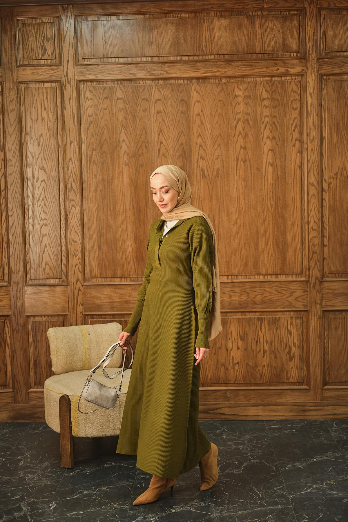 Gizli Düğme Detaylı Elbise Yağ Yeşil