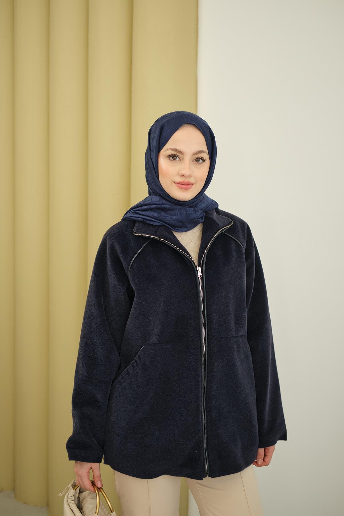 Gizli Fermuar Detay Deri Şeritli Ceket Lacivert