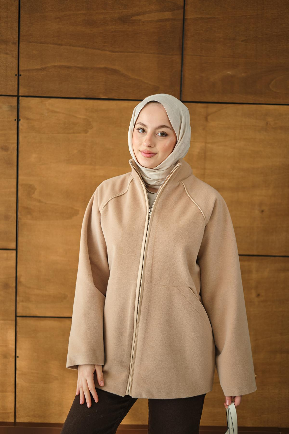 Gizli Fermuar Detay Deri Şeritli Ceket Vizon