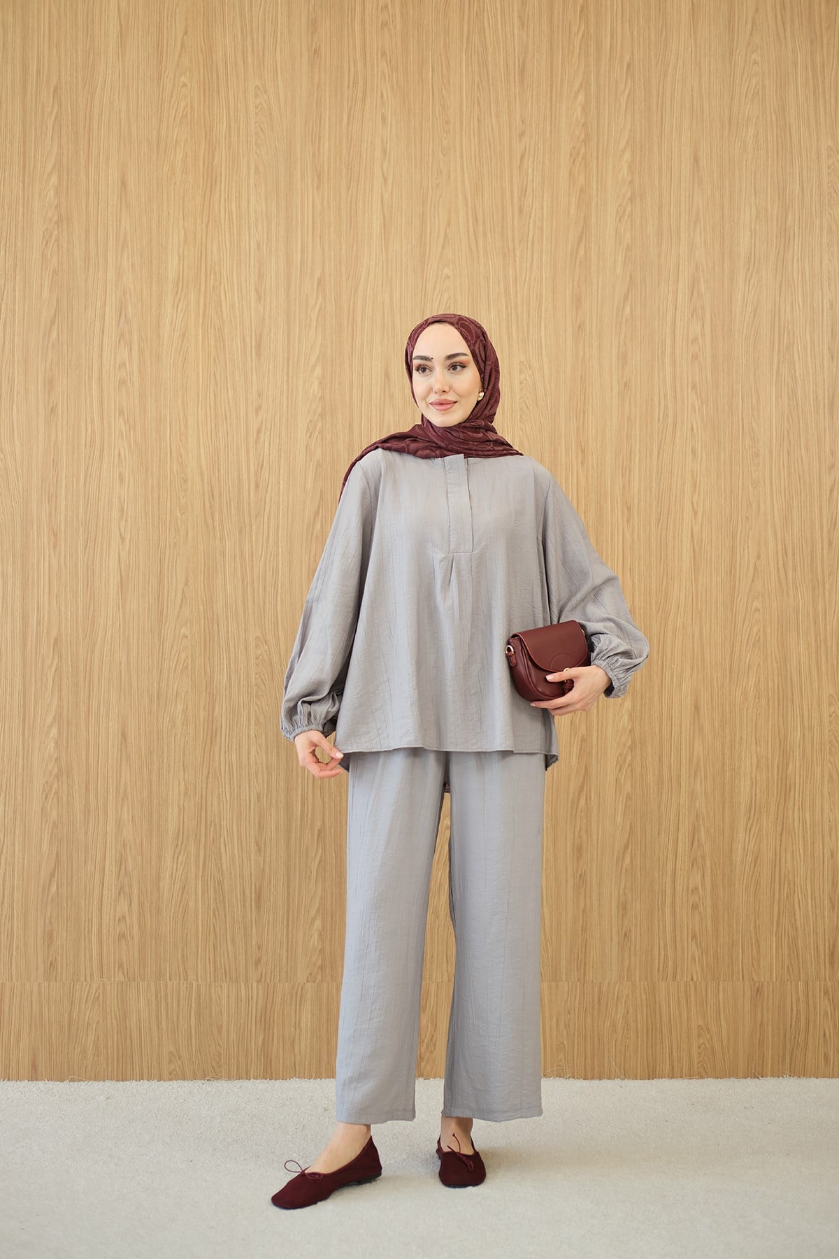 Gizli Fermuar Detaylı Müslin Takım Gri
