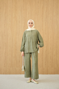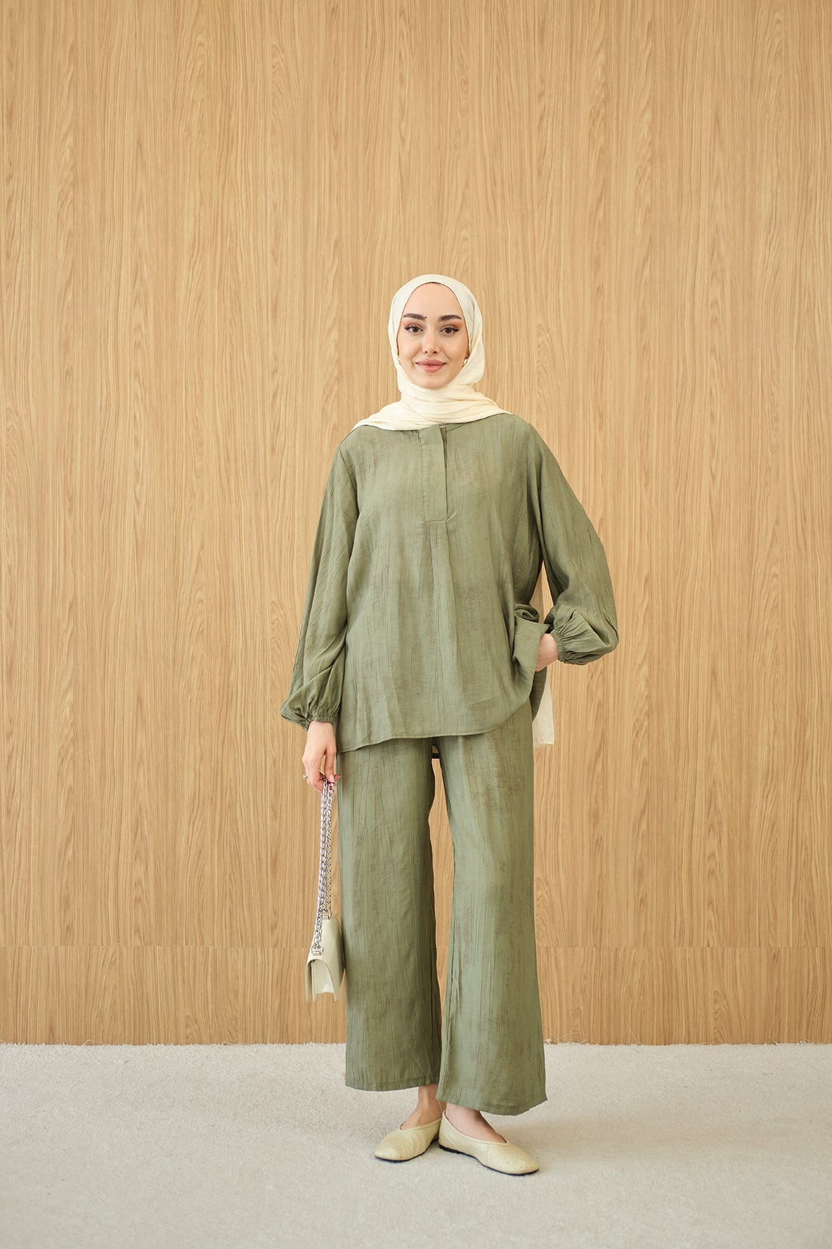 Gizli Fermuar Detaylı Müslin Takım Yeşil