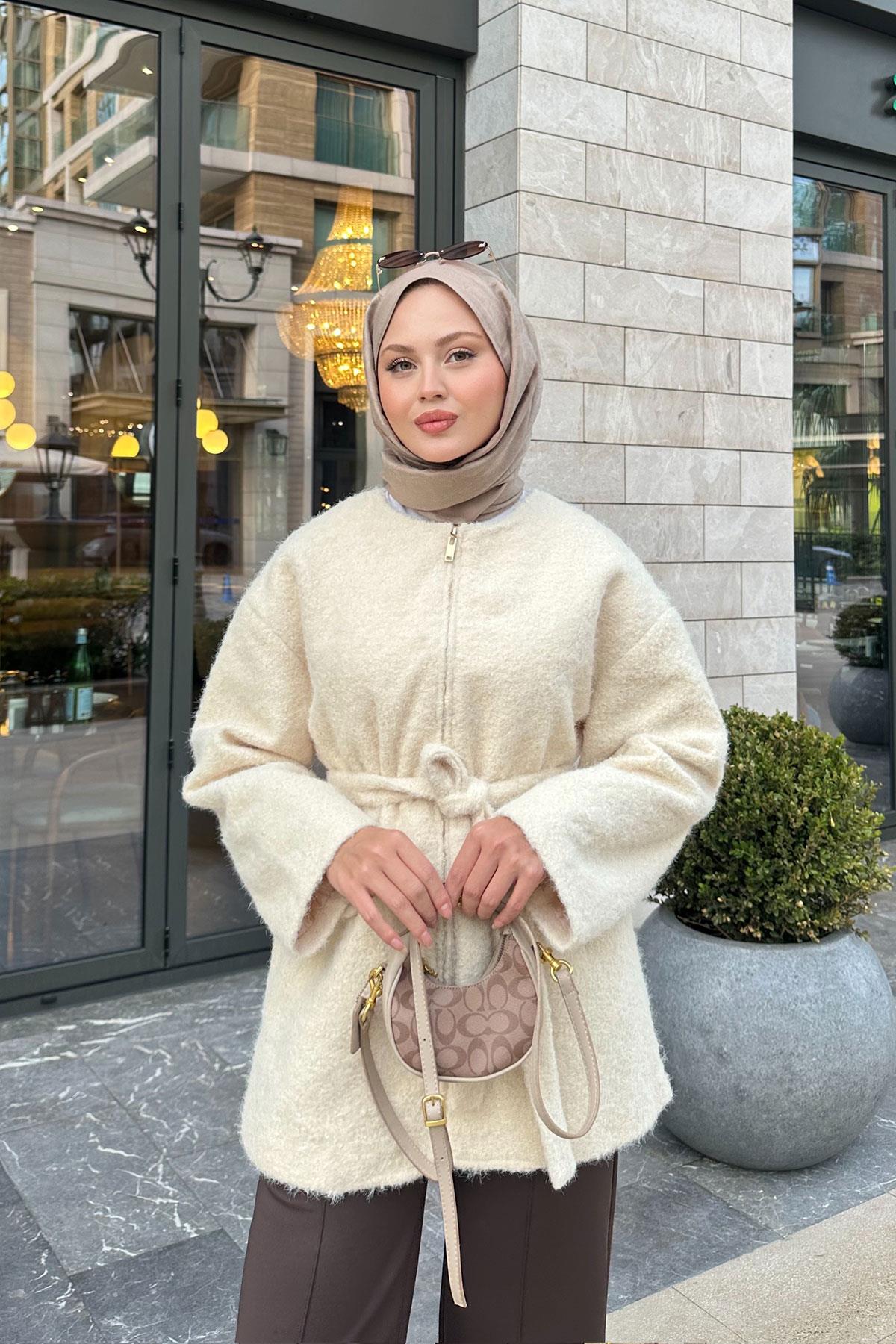 Gizli Fermuarlı Detay Bel Bağlamalı Ceket Krem