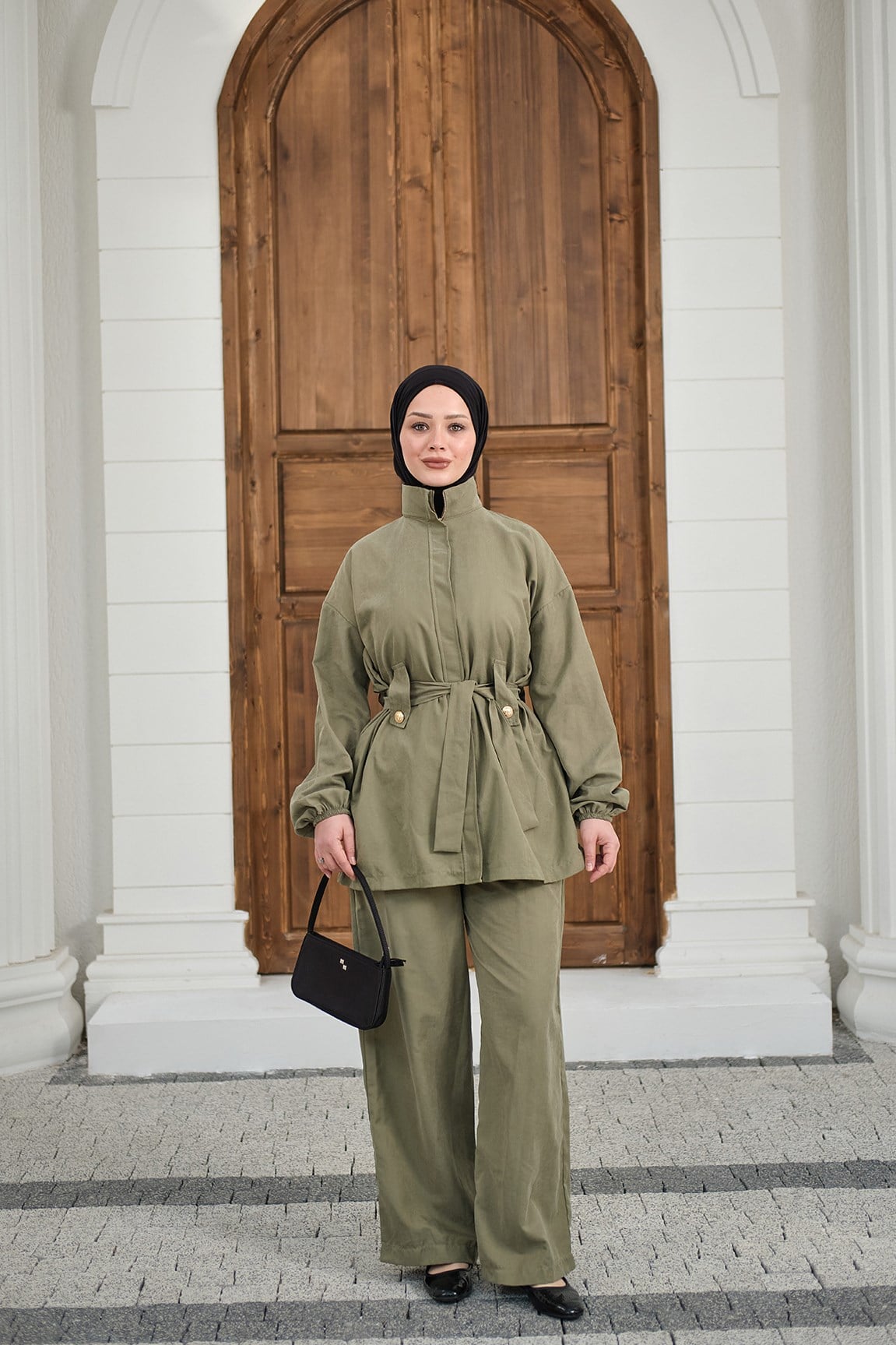 Gizli Fermuarlı Kemerli Pantolonlu Takım Küf Yeşil