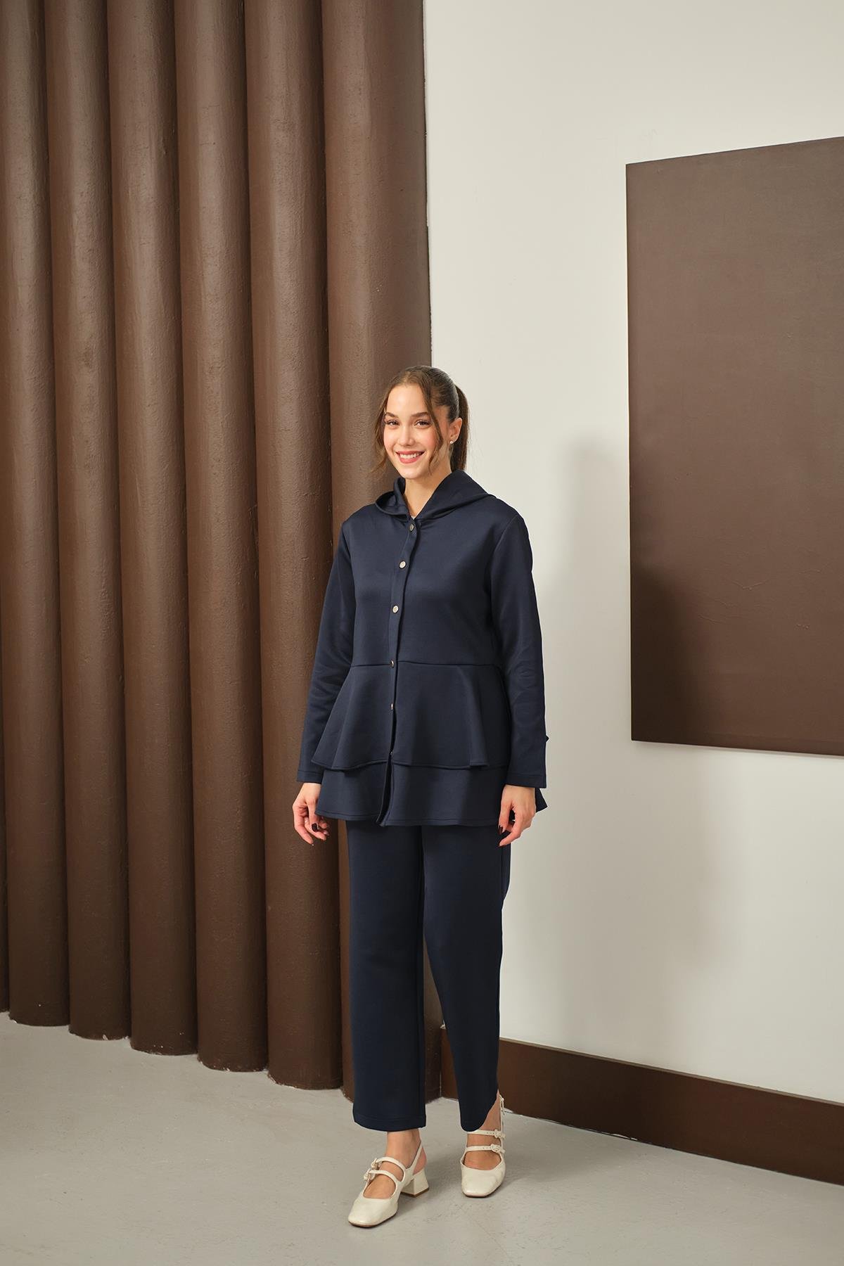 Editör Notu: Modern ve zarif bir görünüm arayanların favorisi olacak bu ikili takım, şıklığı ve rahatlığı bir arada sunuyor. Gold düğme detayları, takıma lüks bir hava katarken, volanlı etek uçları hareketli ve feminen bir dokunuş ekliyor. Hem gündüz hem de gece şıklığınızı tamamlayacak bu takım, tarz detaylarıyla her ortamda dikkatleri üzerinize çekecek. Ofis şıklığından özel davetlere kadar geniş bir kullanım alanına sahip olan bu parça, stil sahibi kadınların vazgeçilmezi olacak.