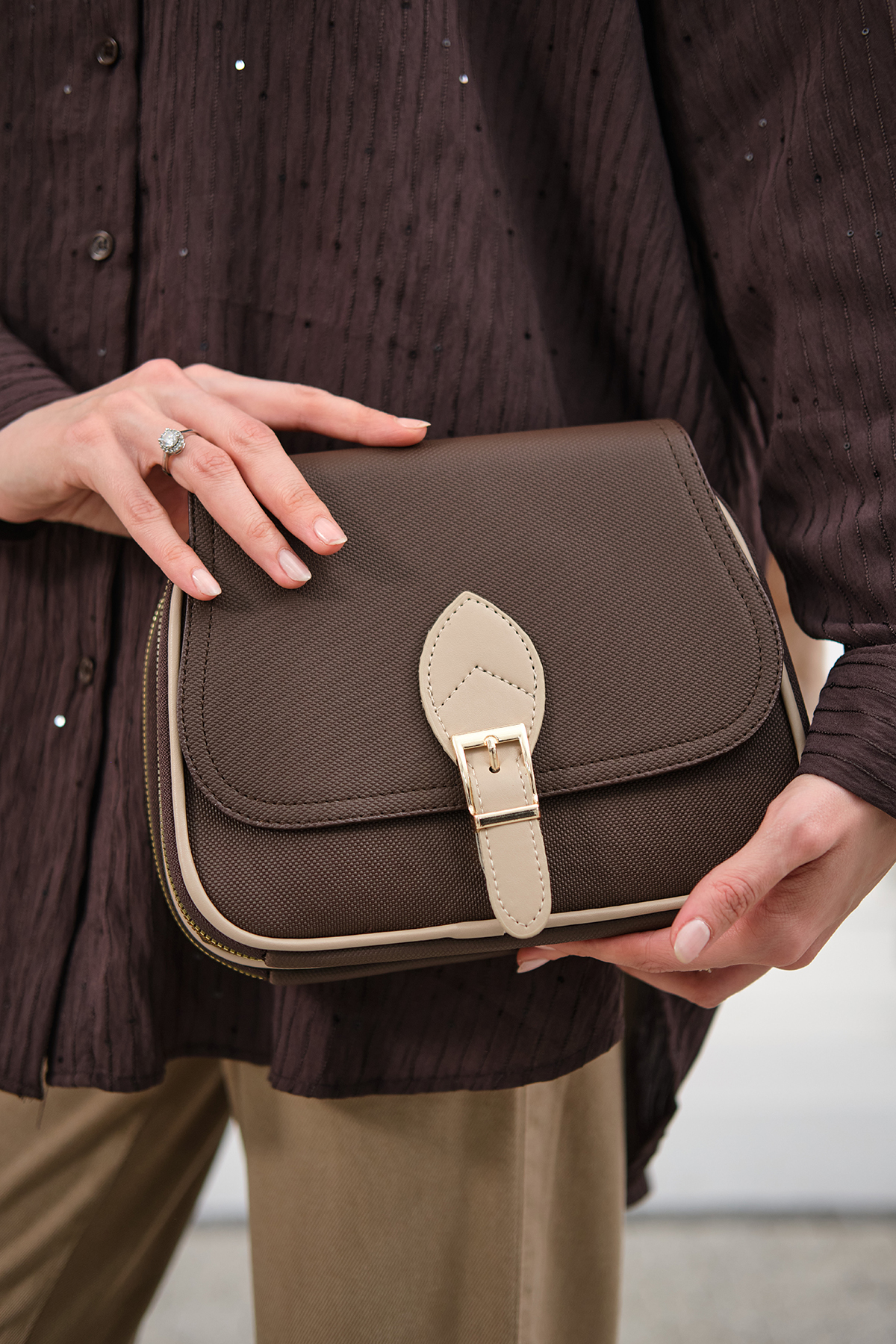 Gold Detay Çift Bölmeli Çanta Kahverengi