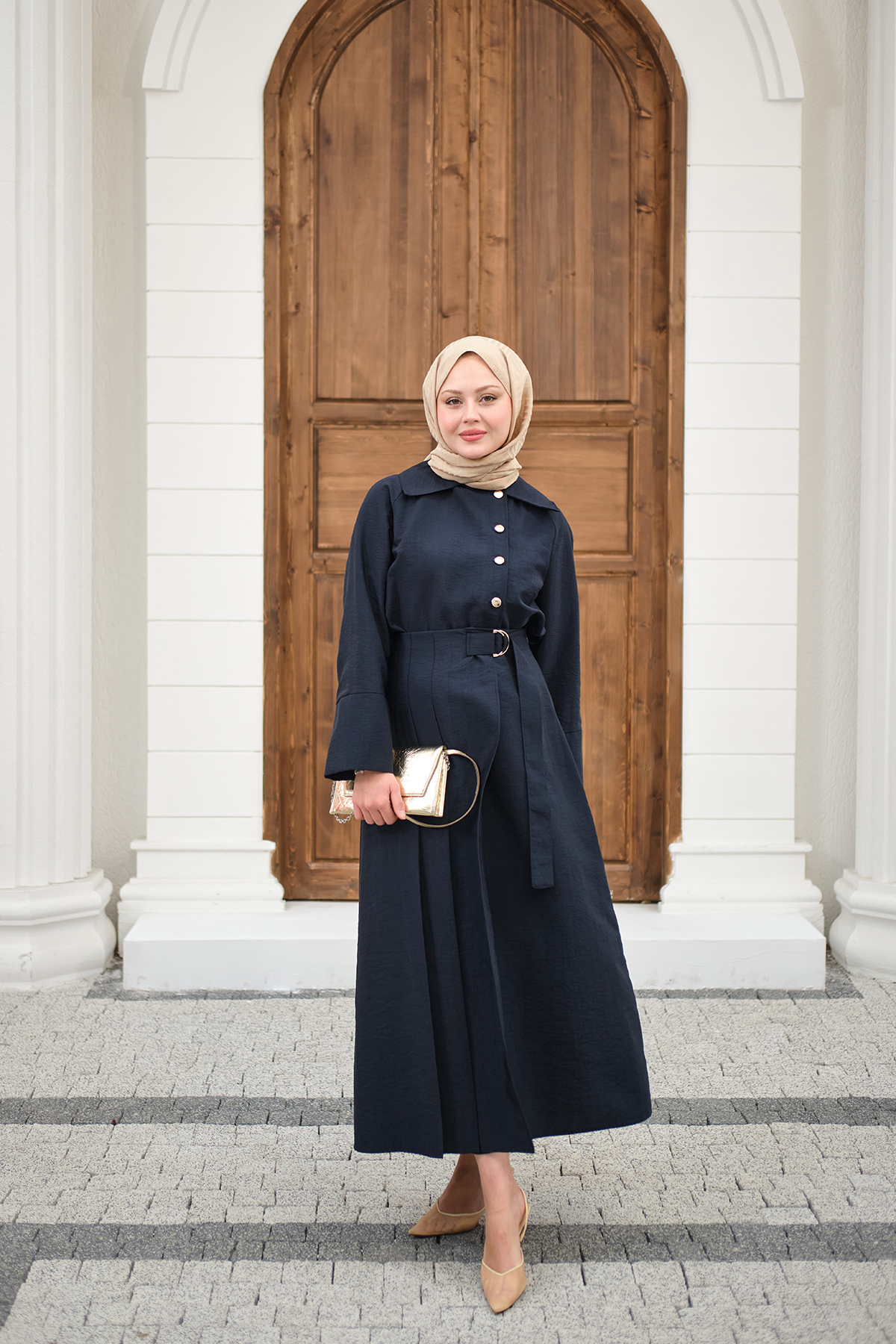 Gold Düğme Detay Etekli Takım Lacivert