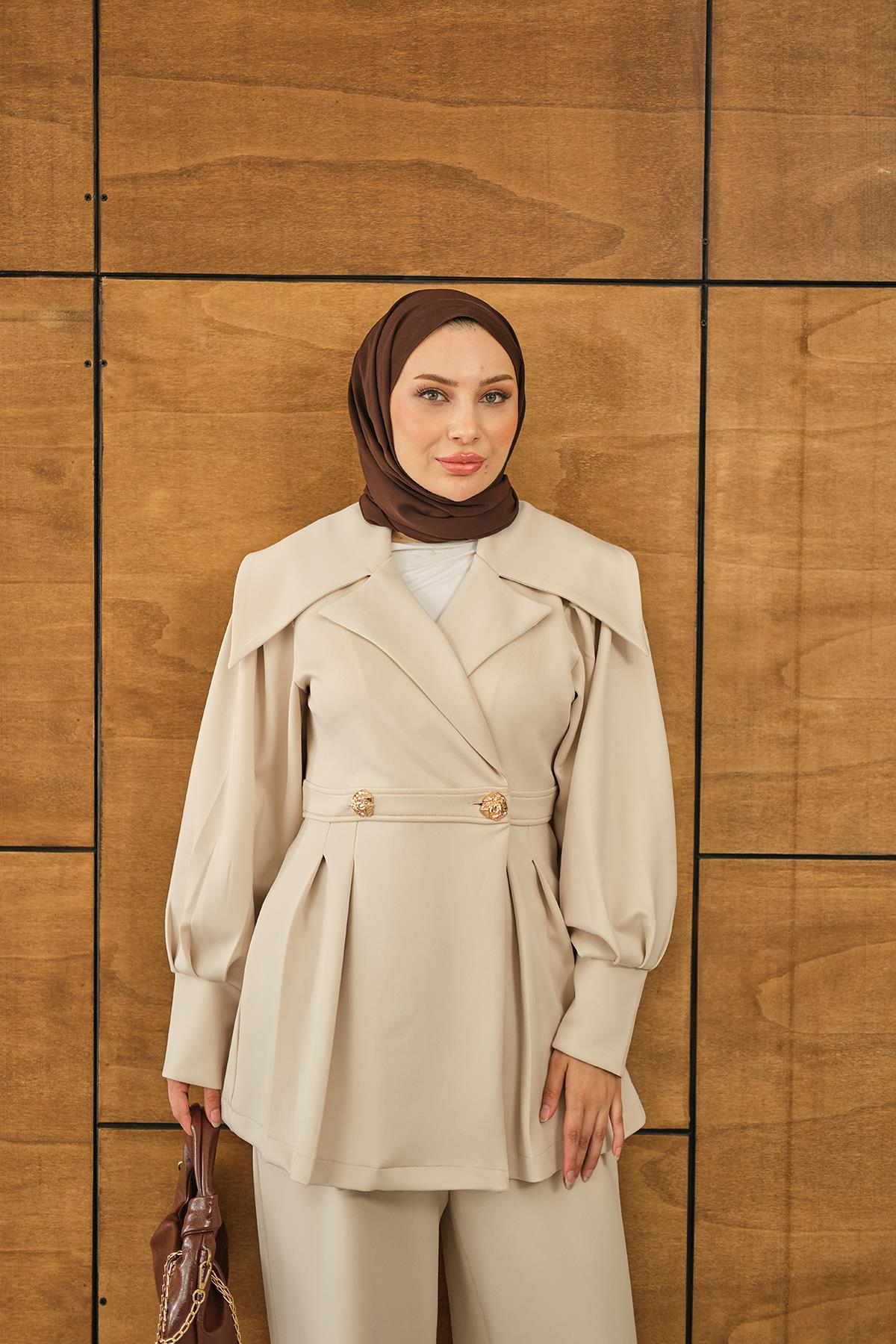 Gold Düğme Detay İkili Takım Krem
