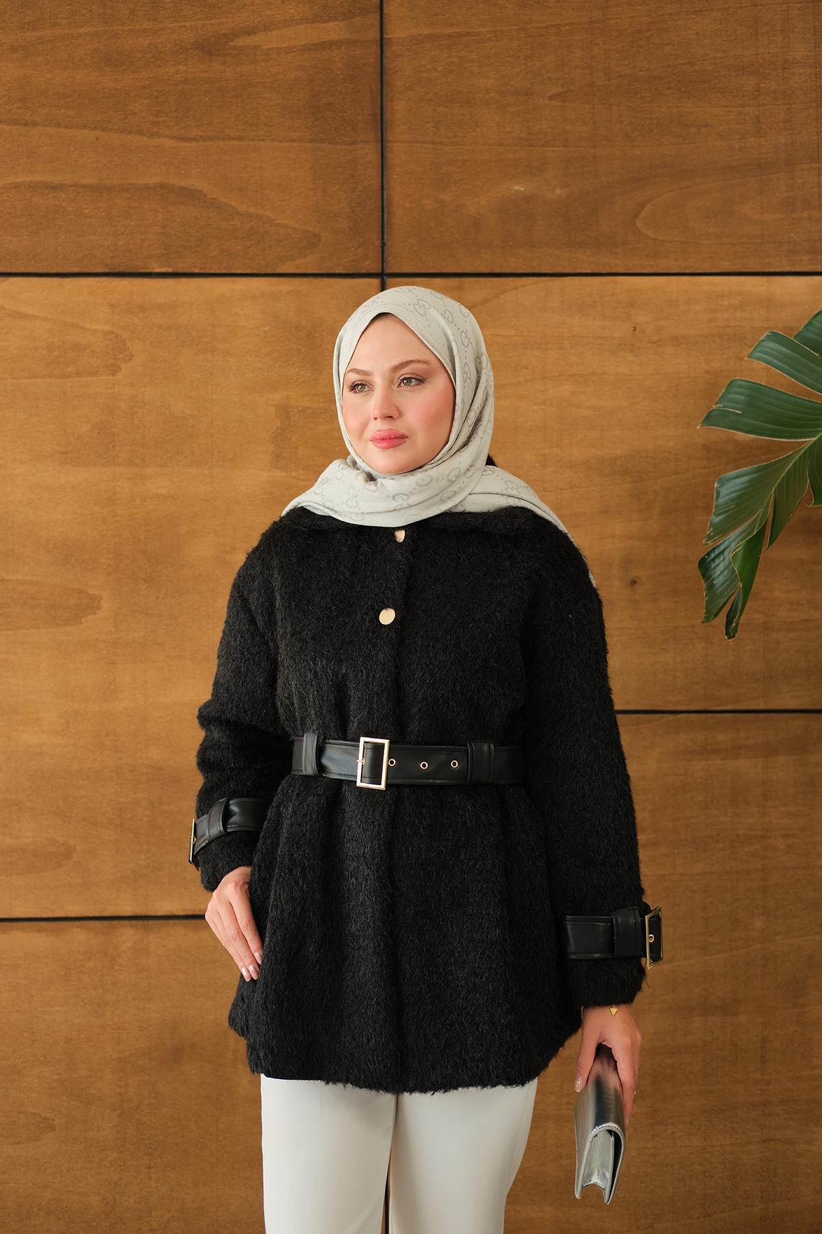 Gold Düğme Detay Kemerli Ceket Siyah