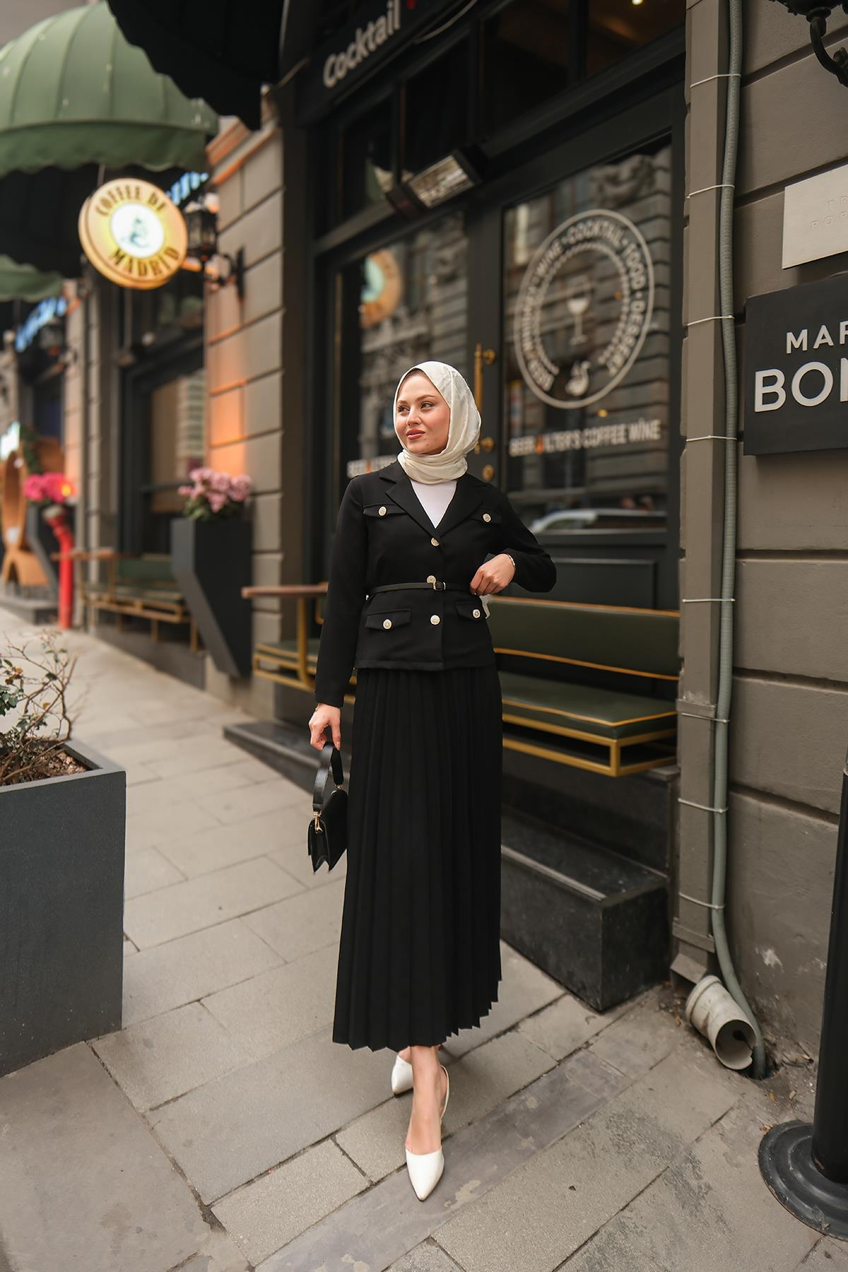 Gold Düğme Detaylı Etekli Takım Siyah