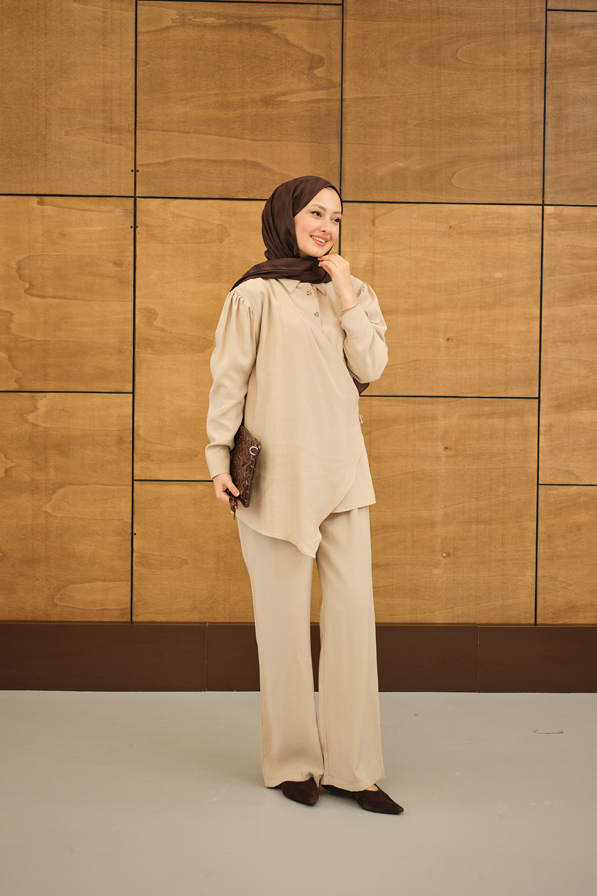 Gold Düğme Detaylı Pantolonlu Modal Takım Vizon