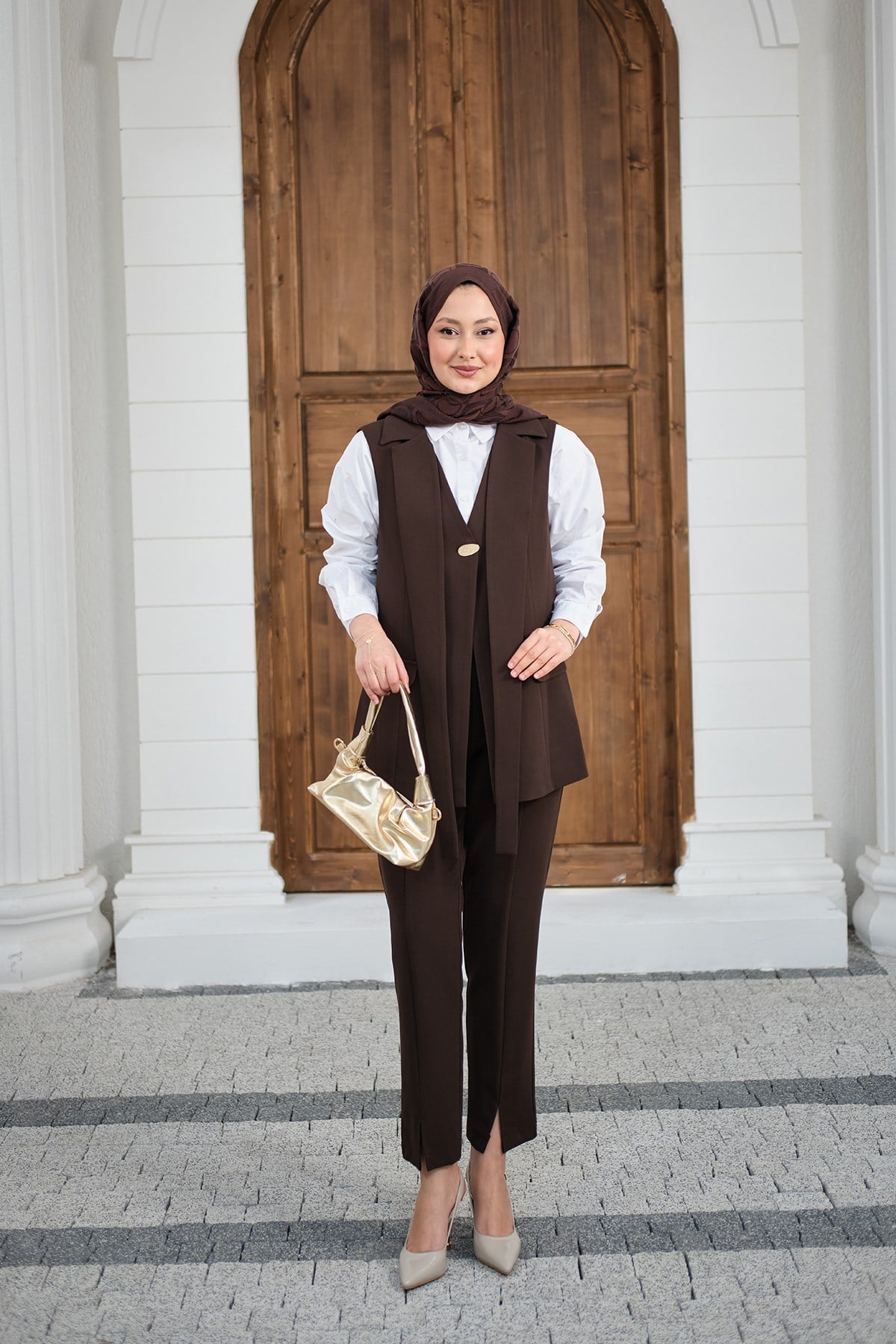 Gold Düğme Detaylı Yelekli Takım Kahverengi