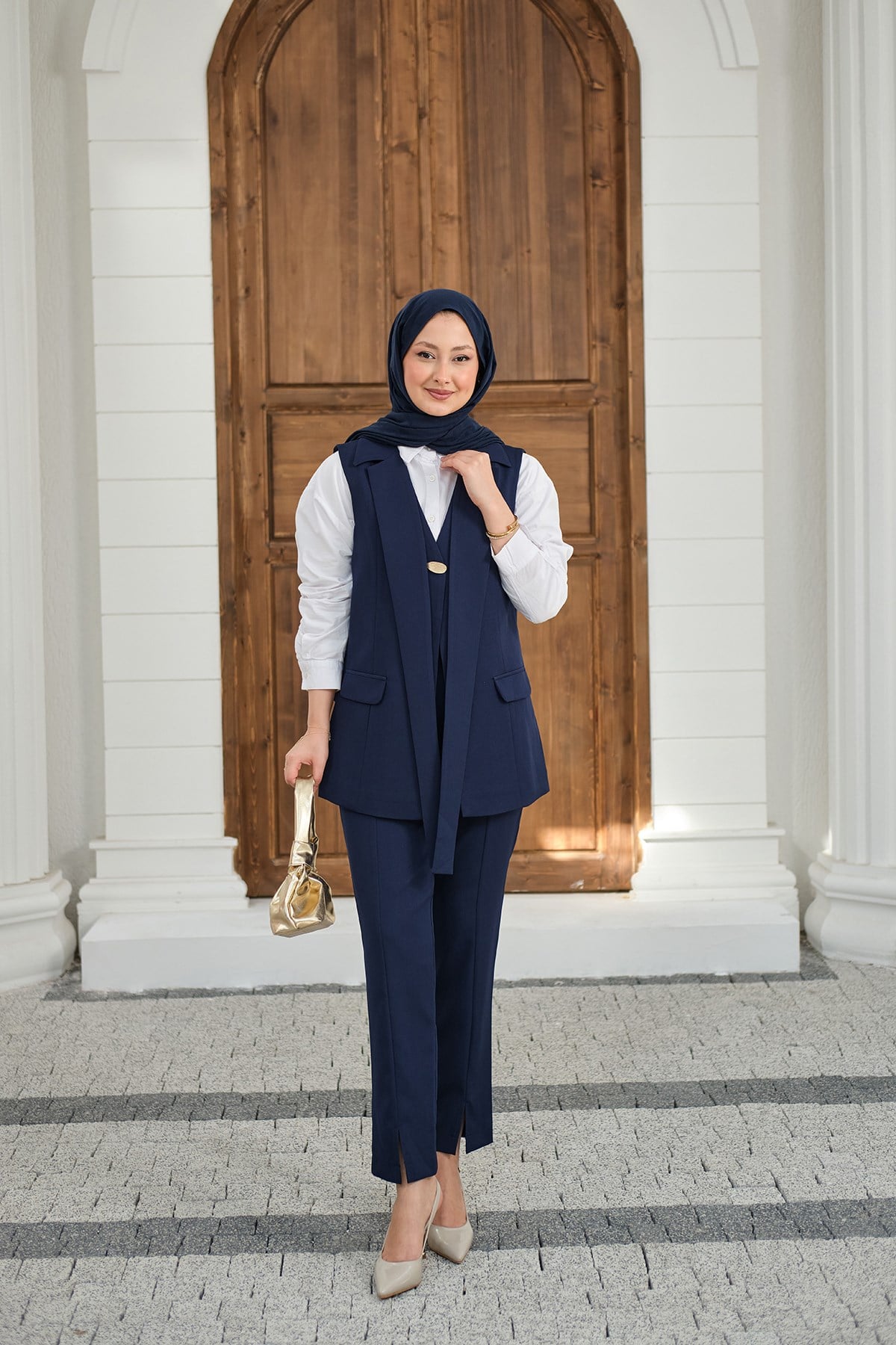 Gold Düğme Detaylı Yelekli Takım Lacivert