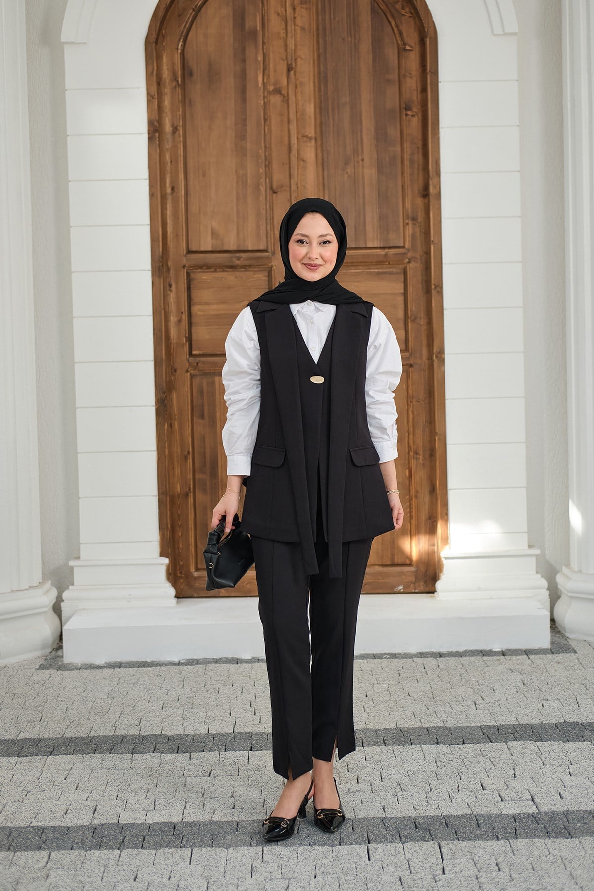 Gold Düğme Detaylı Yelekli Takım Siyah