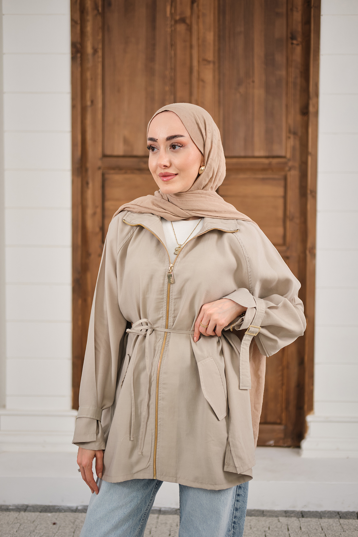 Gold Fermuar Detay Dikiş İzli Ceket Bej