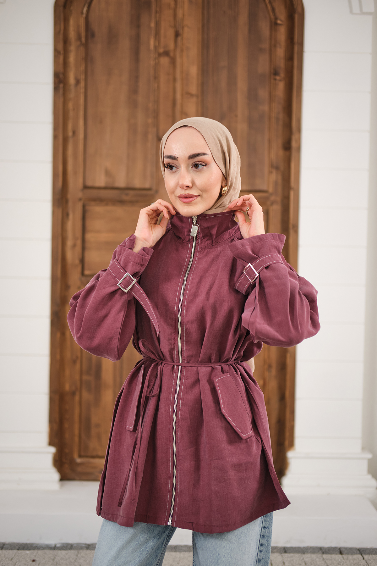 Gold Fermuar Detay Dikiş İzli Ceket Mürdüm