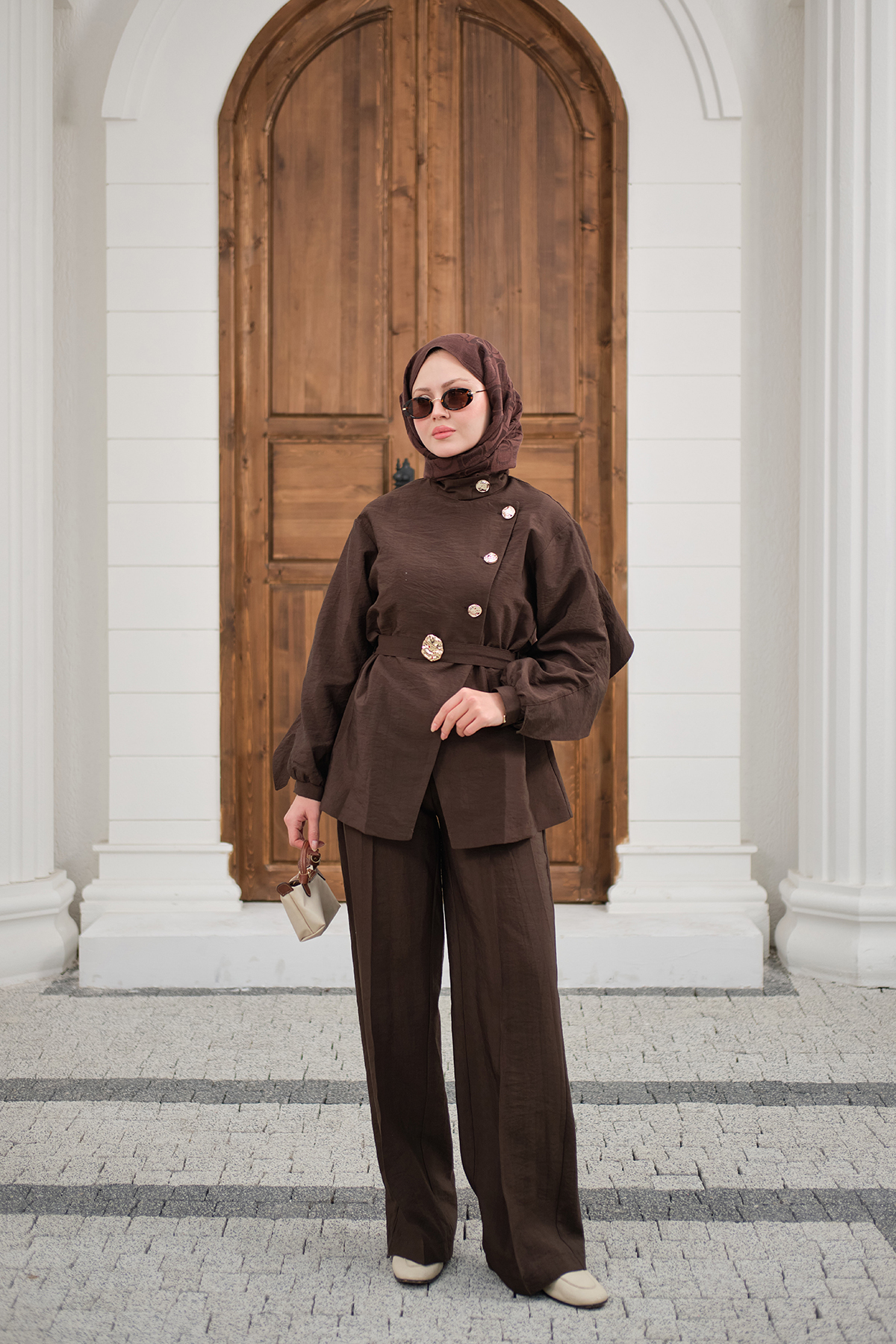 Gold Kemerli Düğme Detay Takım Kahverengi