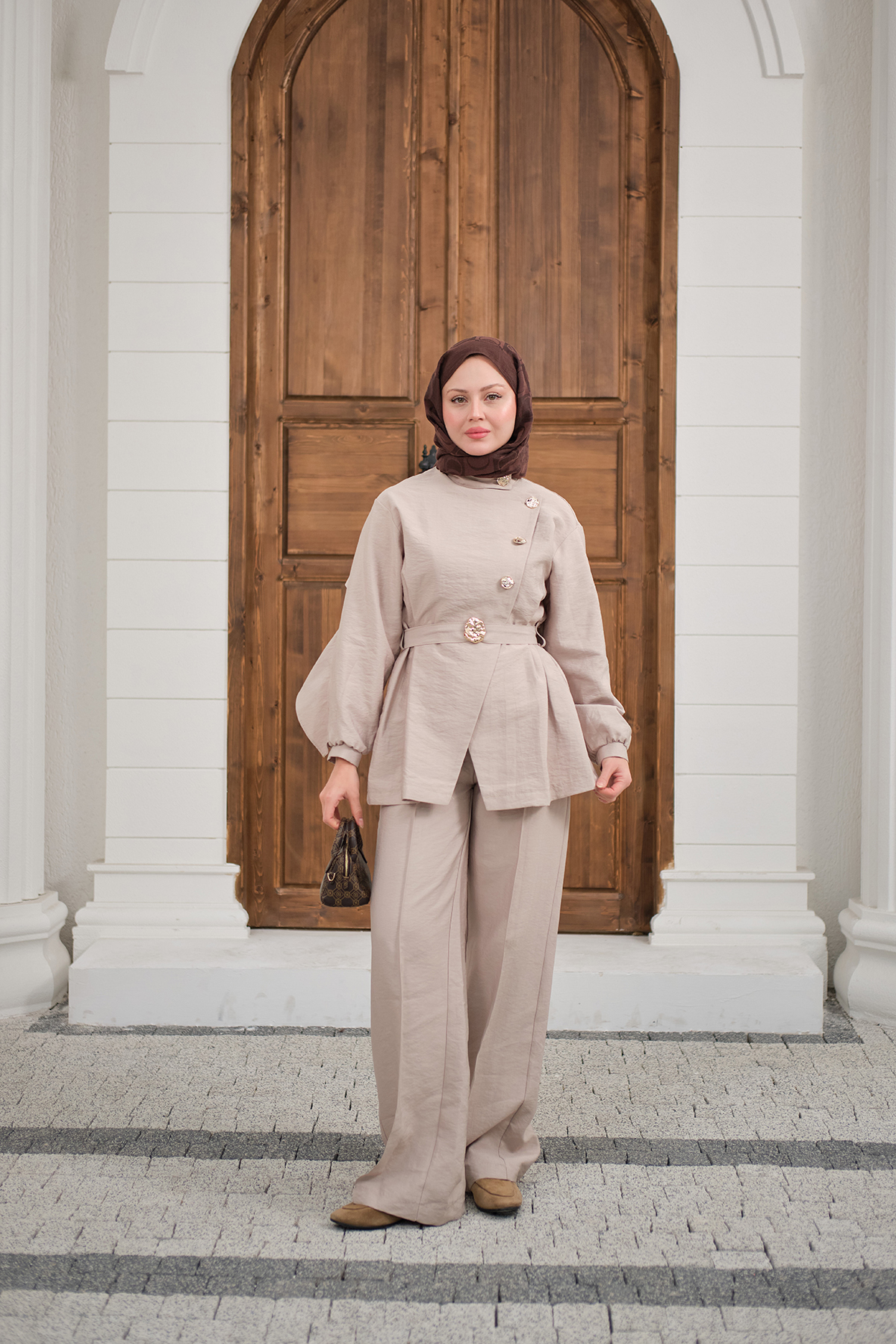 Gold Kemerli Düğme Detay Takım Krem